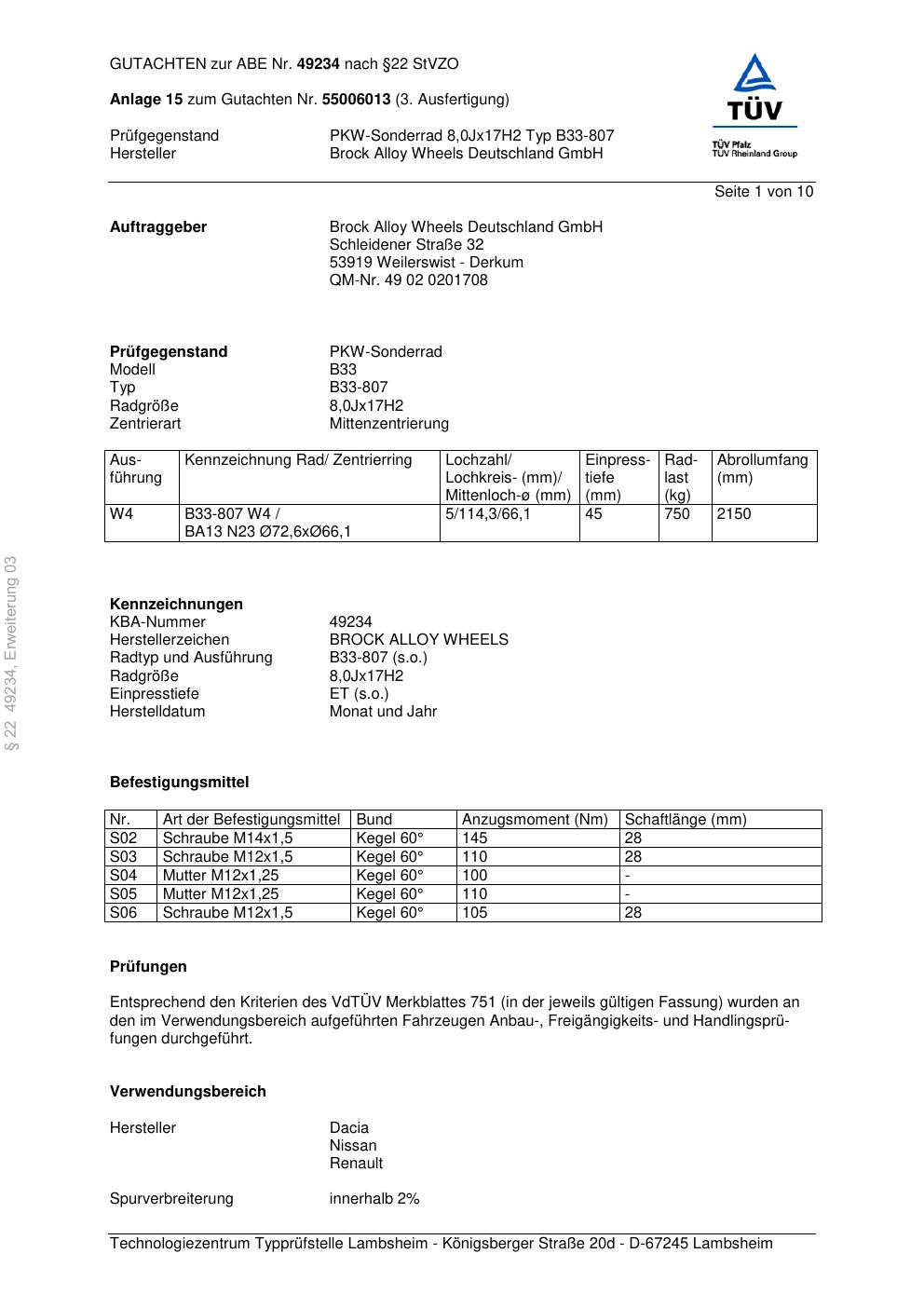 Dieses Gutachten (abe) bezieht sich auf die Alufelge Brock B33-807 in der Ausführung 8Jx17 ET 0, Mittenloch 0 mm (KBA 49234). Im PDF findest du typischerweise zulässige Reifengrößen, Auflagen/Anbauhinweise und – je nach Dokument – Hinweise zur Eintragung.