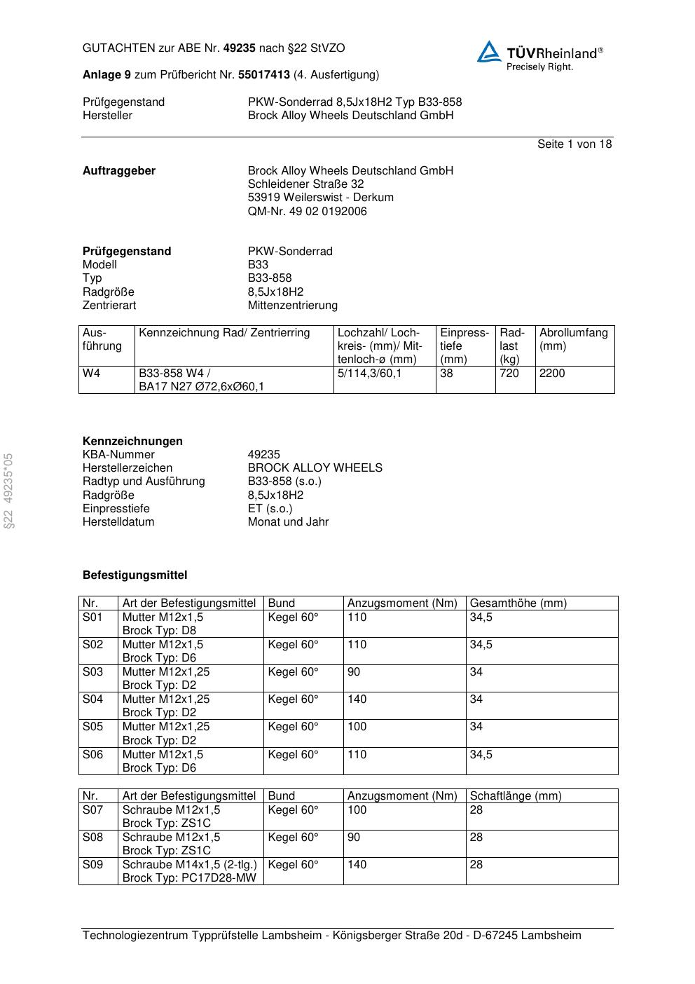 Dieses Gutachten (abe) bezieht sich auf die Alufelge Brock B33-858 in der Ausführung 8.5Jx18 ET 0, Mittenloch 0 mm (KBA 49235). Im PDF findest du typischerweise zulässige Reifengrößen, Auflagen/Anbauhinweise und – je nach Dokument – Hinweise zur Eintragung.