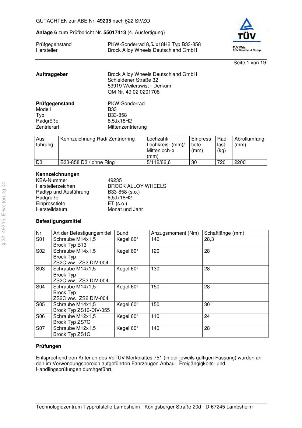 Dieses Gutachten (abe) bezieht sich auf die Alufelge Brock B33-858 in der Ausführung 8.5Jx18 ET 0, Mittenloch 0 mm (KBA 49235). Im PDF findest du typischerweise zulässige Reifengrößen, Auflagen/Anbauhinweise und – je nach Dokument – Hinweise zur Eintragung.