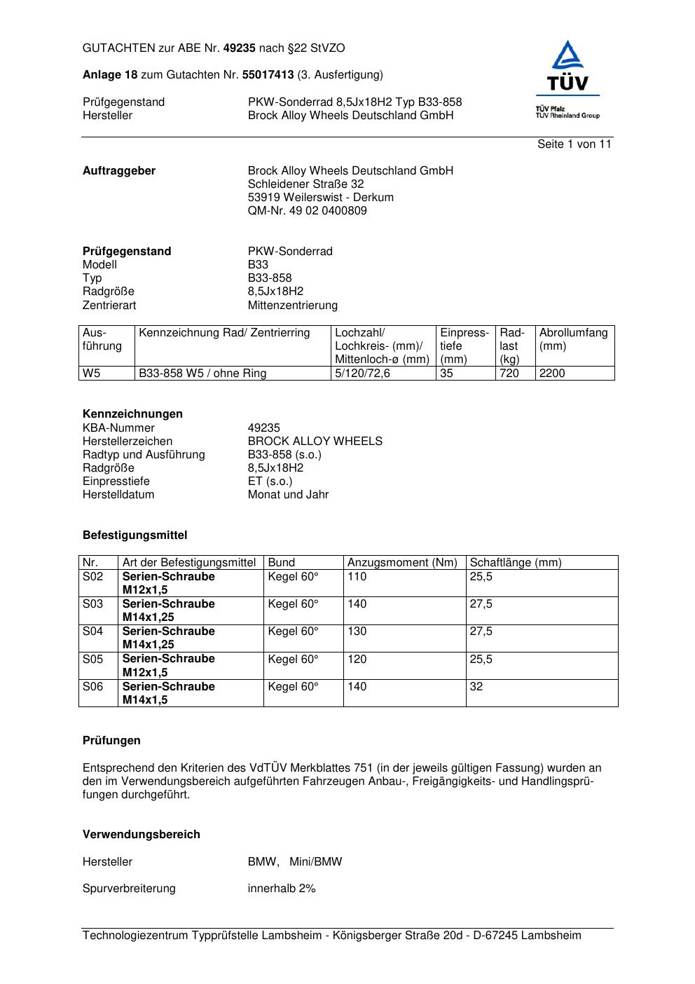 Dieses Gutachten (abe) bezieht sich auf die Alufelge Brock B33-858 in der Ausführung 8.5Jx18 ET 0, Mittenloch 0 mm (KBA 49235). Im PDF findest du typischerweise zulässige Reifengrößen, Auflagen/Anbauhinweise und – je nach Dokument – Hinweise zur Eintragung.