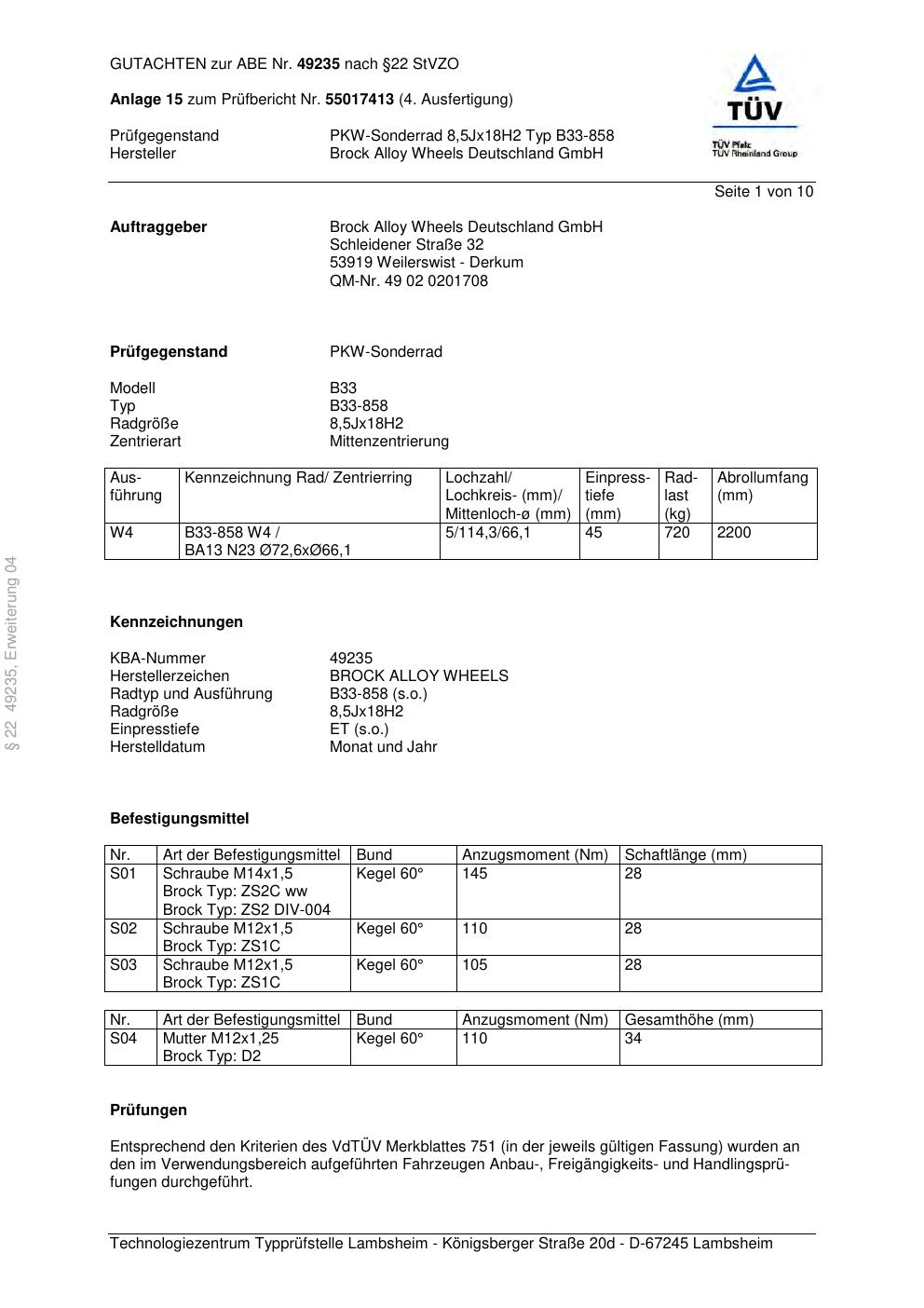 Dieses Gutachten (abe) bezieht sich auf die Alufelge Brock B33-858 in der Ausführung 8.5Jx18 ET 0, Mittenloch 0 mm (KBA 49235). Im PDF findest du typischerweise zulässige Reifengrößen, Auflagen/Anbauhinweise und – je nach Dokument – Hinweise zur Eintragung.