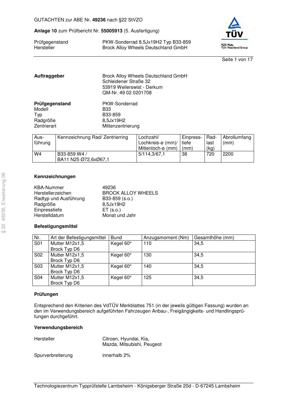 Dieses Gutachten (abe) bezieht sich auf die Alufelge Brock B33-859 in der Ausführung 8.5Jx19 ET 0, Mittenloch 0 mm (KBA 49236). Im PDF findest du typischerweise zulässige Reifengrößen, Auflagen/Anbauhinweise und – je nach Dokument – Hinweise zur Eintragung.