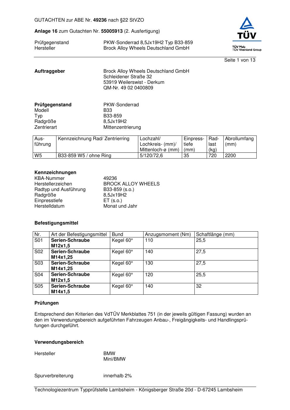 Dieses Gutachten (abe) bezieht sich auf die Alufelge Brock B33-859 in der Ausführung 8.5Jx19 ET 0, Mittenloch 0 mm (KBA 49236). Im PDF findest du typischerweise zulässige Reifengrößen, Auflagen/Anbauhinweise und – je nach Dokument – Hinweise zur Eintragung.