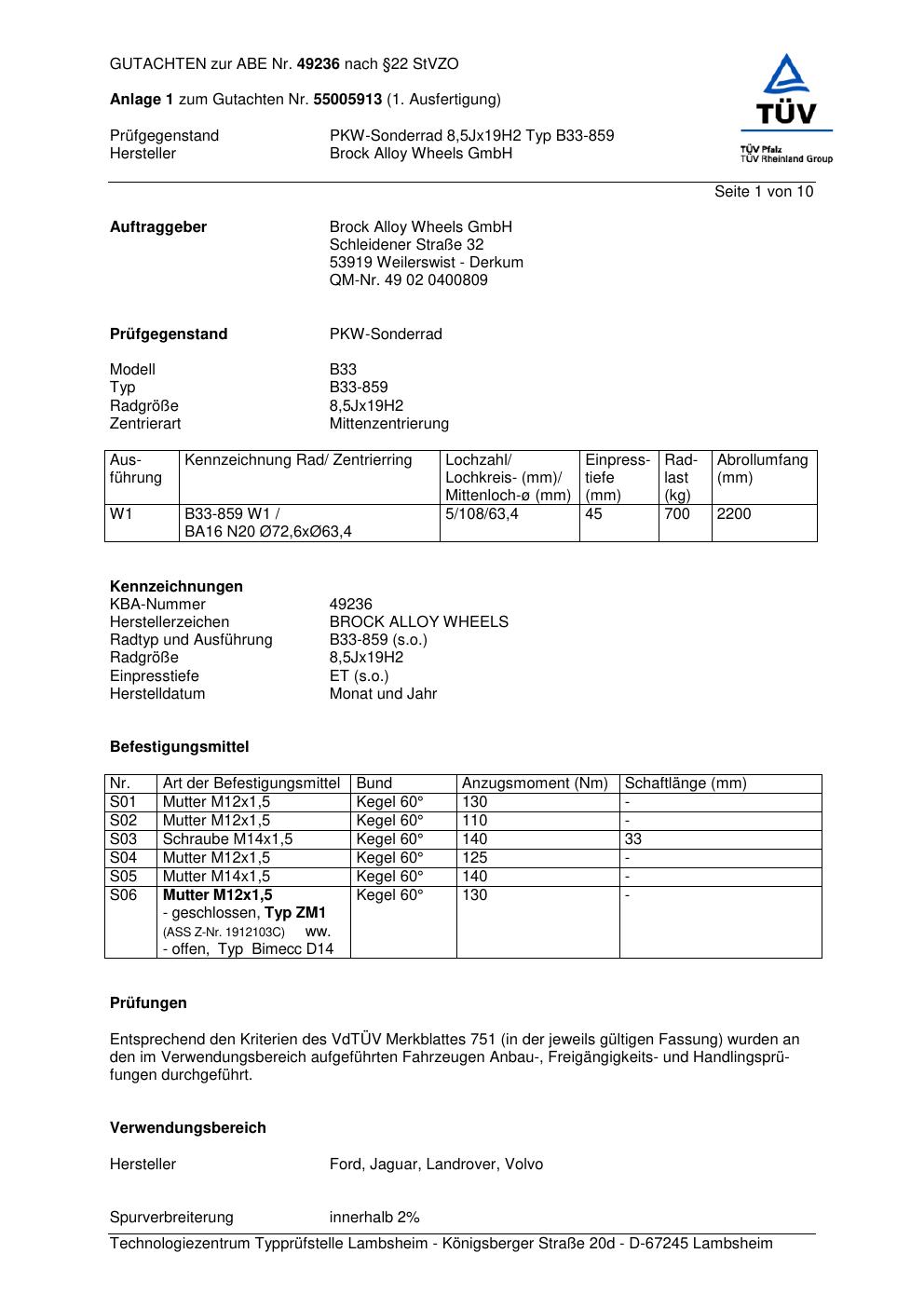 Dieses Gutachten (abe) bezieht sich auf die Alufelge Brock B33-859 in der Ausführung 8.5Jx19 ET 0, Mittenloch 0 mm (KBA 49236). Im PDF findest du typischerweise zulässige Reifengrößen, Auflagen/Anbauhinweise und – je nach Dokument – Hinweise zur Eintragung.