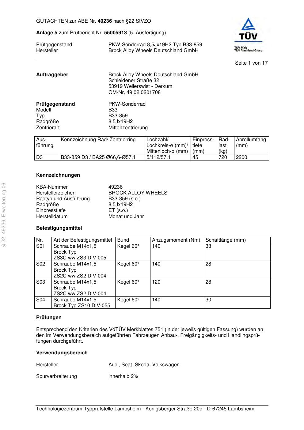 Felgengutachten / abe für Alufelgen Brock B33-859 (8.5Jx19 ET 0, Mittenloch 0 mm) mit KBA 49236 (Zertifikatsnummer 49236). Hier kostenlos als PDF herunterladen. Der Download-Link ist 24 Stunden gültig und kann bis zu zwei Mal verwendet werden.