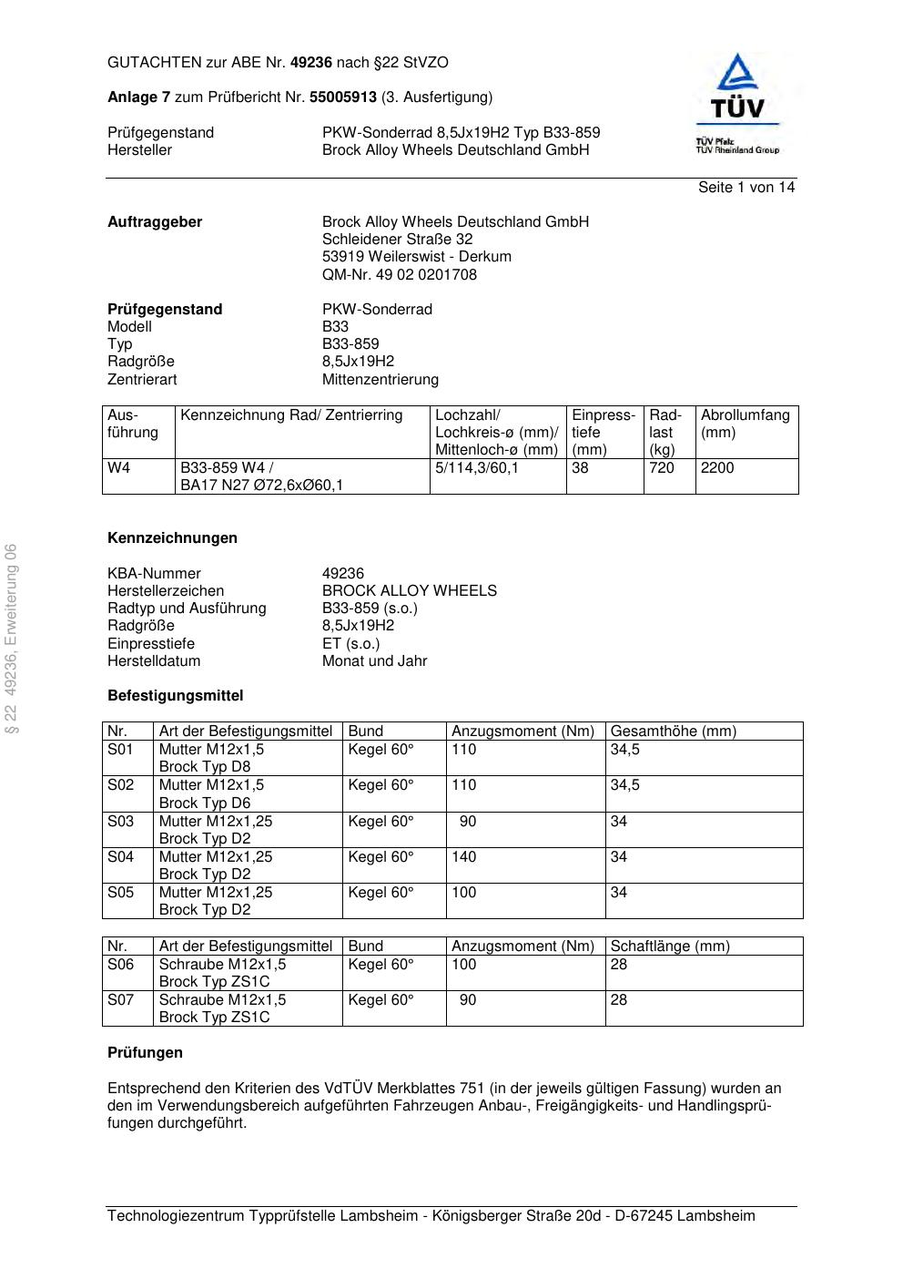 Dieses Gutachten (abe) bezieht sich auf die Alufelge Brock B33-859 in der Ausführung 8.5Jx19 ET 0, Mittenloch 0 mm (KBA 49236). Im PDF findest du typischerweise zulässige Reifengrößen, Auflagen/Anbauhinweise und – je nach Dokument – Hinweise zur Eintragung.