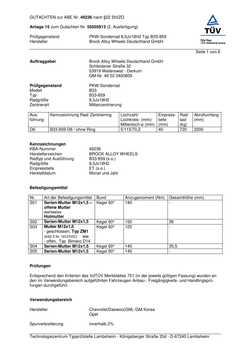 Dieses Gutachten (abe) bezieht sich auf die Alufelge Brock B33-859 in der Ausführung 8.5Jx19 ET 0, Mittenloch 0 mm (KBA 49236). Im PDF findest du typischerweise zulässige Reifengrößen, Auflagen/Anbauhinweise und – je nach Dokument – Hinweise zur Eintragung.
