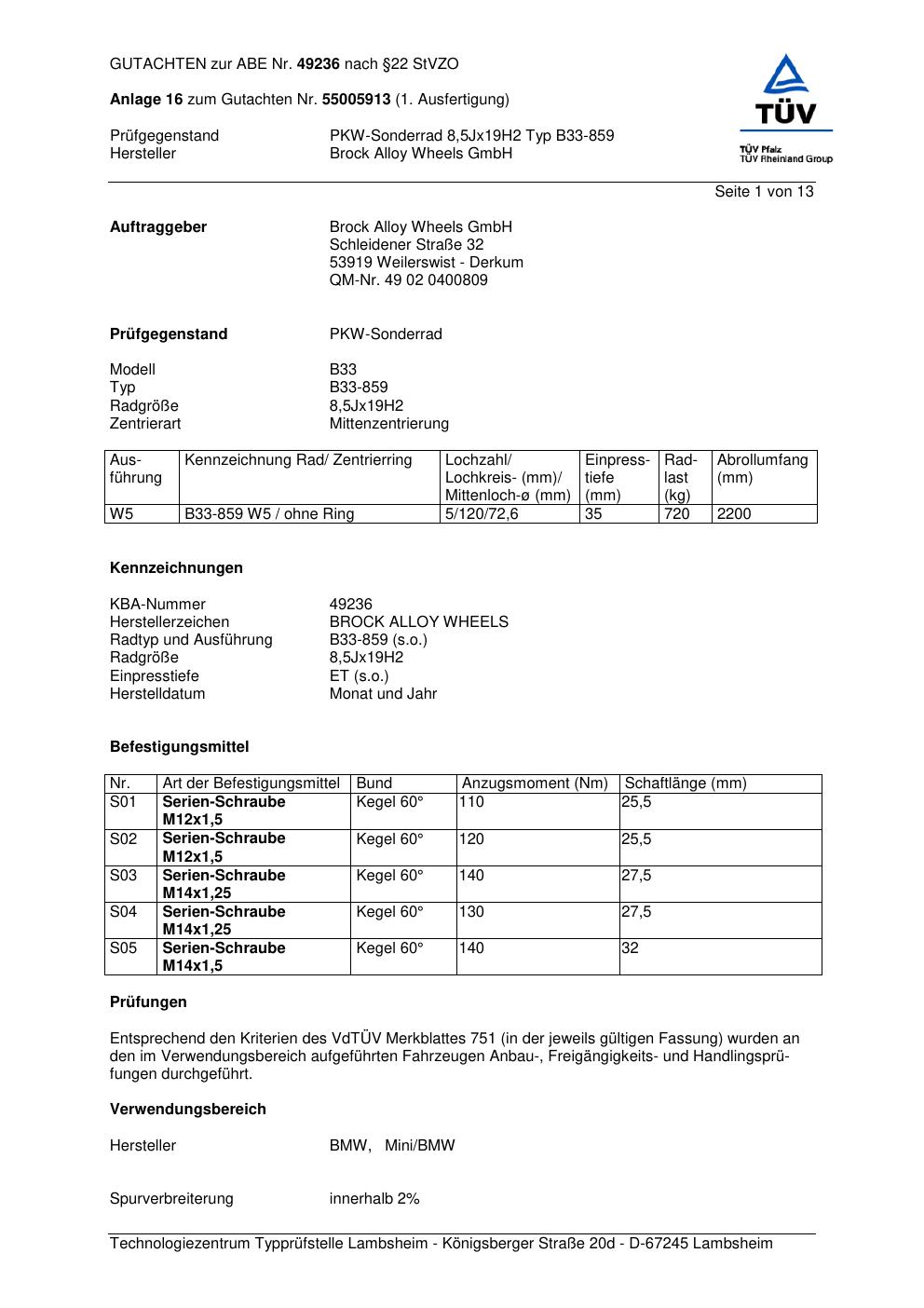 Dieses Gutachten (abe) bezieht sich auf die Alufelge Brock B33-859 in der Ausführung 8.5Jx19 ET 0, Mittenloch 0 mm (KBA 49236). Im PDF findest du typischerweise zulässige Reifengrößen, Auflagen/Anbauhinweise und – je nach Dokument – Hinweise zur Eintragung.