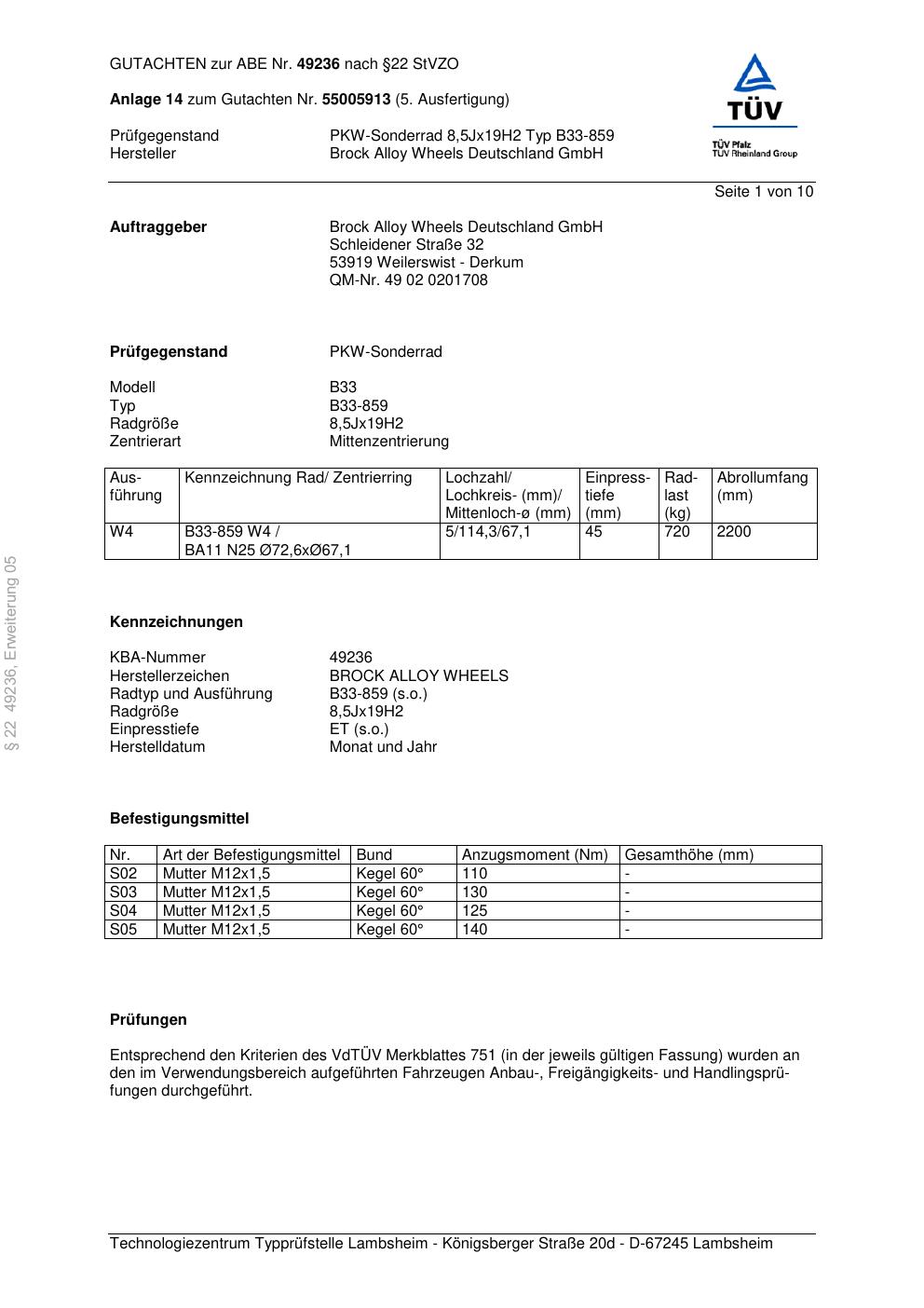 Dieses Gutachten (abe) bezieht sich auf die Alufelge Brock B33-859 in der Ausführung 8.5Jx19 ET 0, Mittenloch 0 mm (KBA 49236). Im PDF findest du typischerweise zulässige Reifengrößen, Auflagen/Anbauhinweise und – je nach Dokument – Hinweise zur Eintragung.