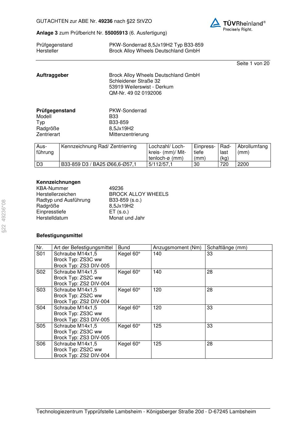 Felgengutachten / abe für Alufelgen Brock B33-859 (8.5Jx19 ET 0, Mittenloch 0 mm) mit KBA 49236 (Zertifikatsnummer 49236). Hier kostenlos als PDF herunterladen. Der Download-Link ist 24 Stunden gültig und kann bis zu zwei Mal verwendet werden.