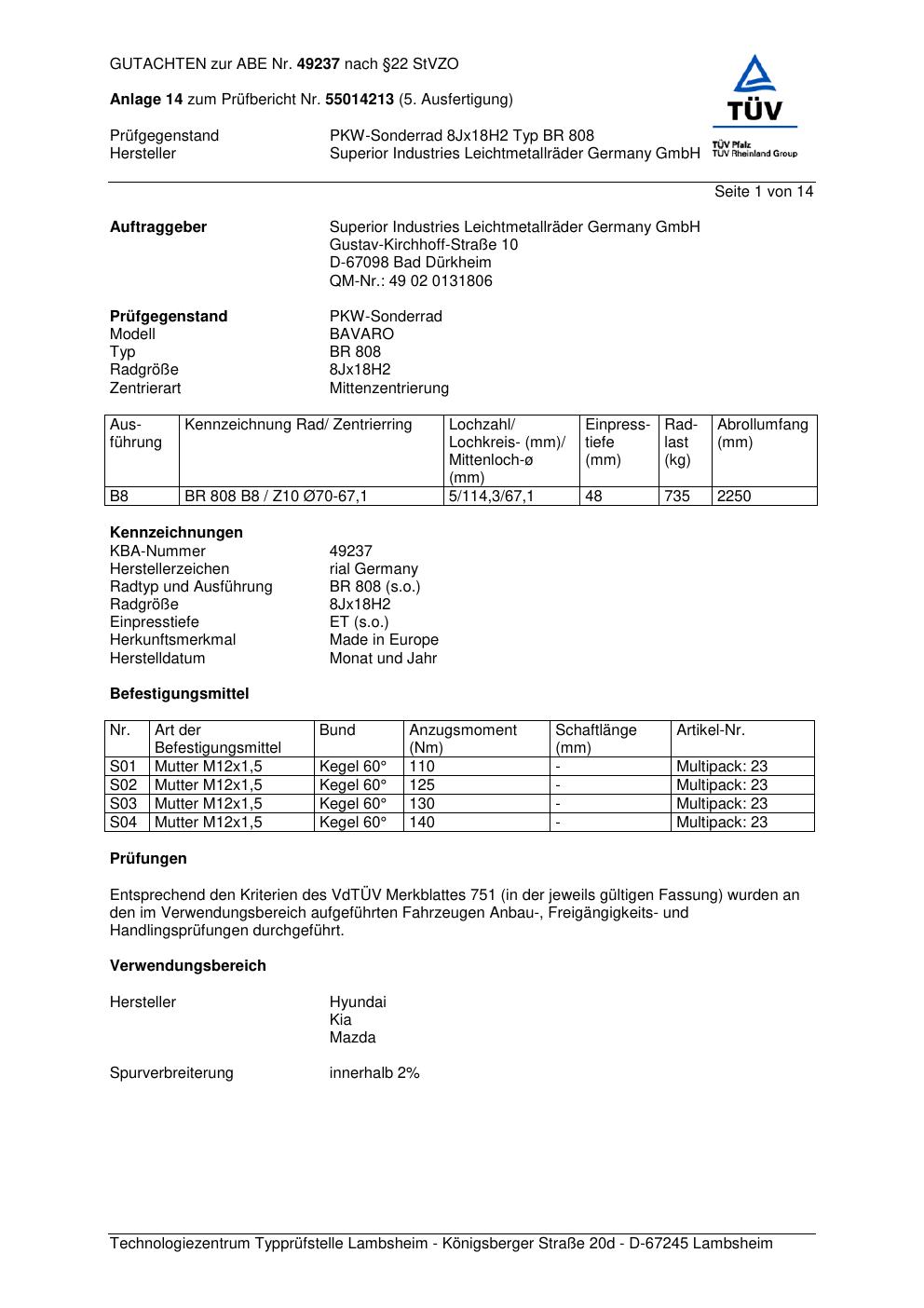 Dieses Gutachten (abe) bezieht sich auf die Alufelge brand-rial BR 808 in der Ausführung 8Jx18 ET 0, Mittenloch 0 mm (KBA 49237). Im PDF findest du typischerweise zulässige Reifengrößen, Auflagen/Anbauhinweise und – je nach Dokument – Hinweise zur Eintragung.