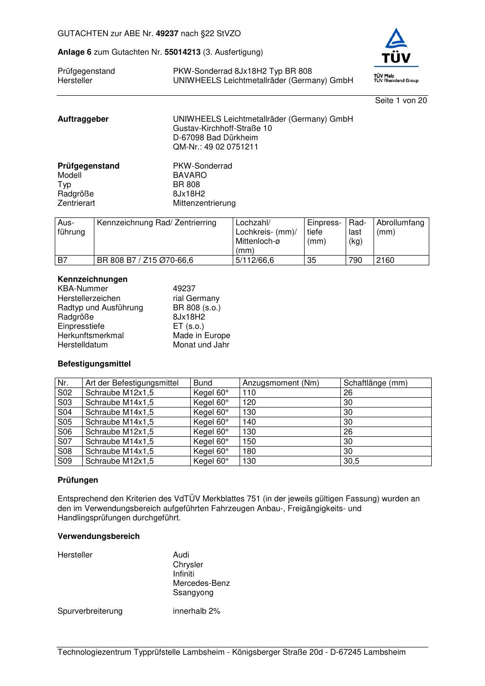 Felgengutachten / abe für Alufelgen brand-rial BR 808 (8Jx18 ET 0, Mittenloch 0 mm) mit KBA 49237 (Zertifikatsnummer 49237). Hier kostenlos als PDF herunterladen. Der Download-Link ist 24 Stunden gültig und kann bis zu zwei Mal verwendet werden.