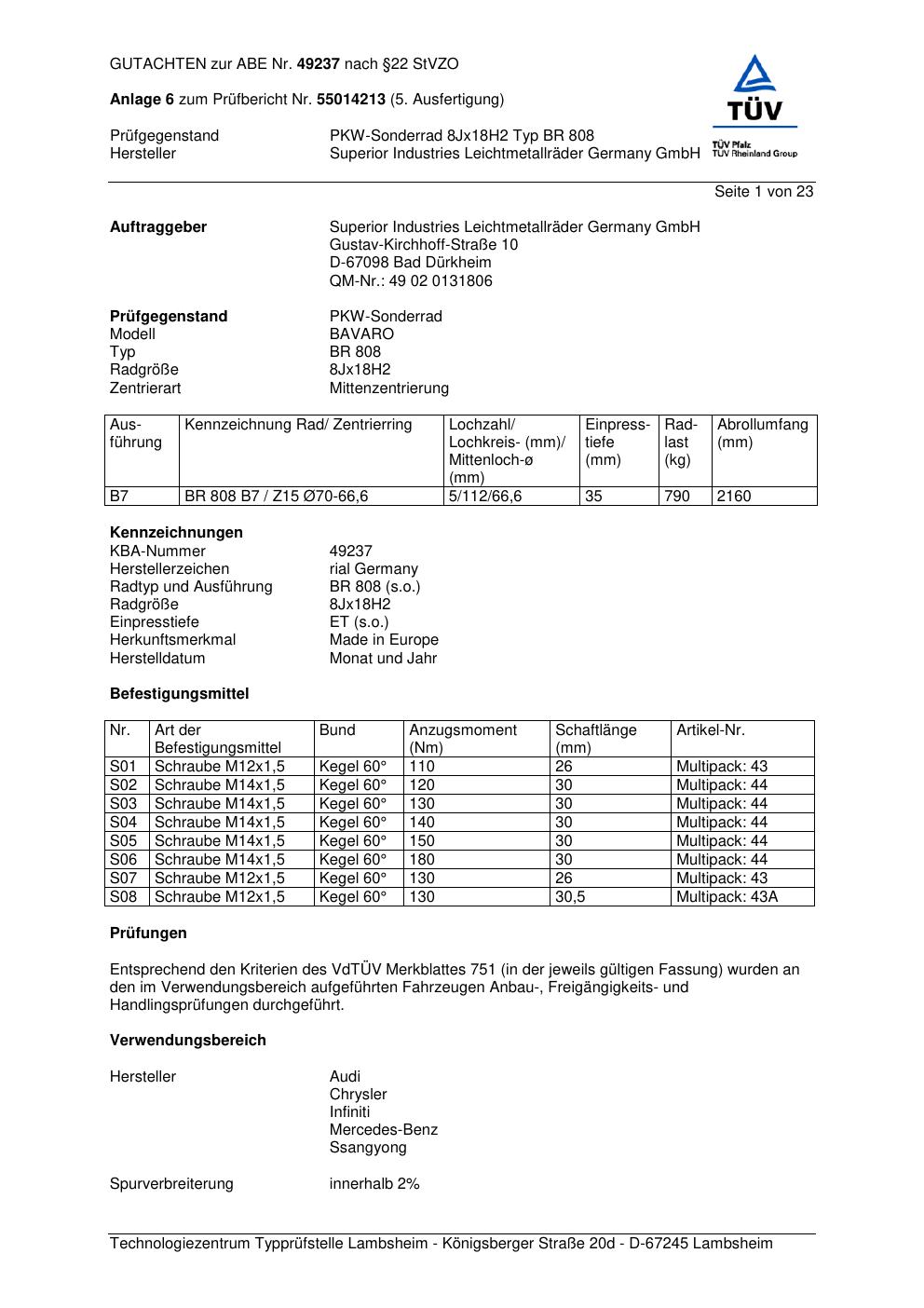 Felgengutachten / abe für Alufelgen brand-rial BR 808 (8Jx18 ET 0, Mittenloch 0 mm) mit KBA 49237 (Zertifikatsnummer 49237). Hier kostenlos als PDF herunterladen. Der Download-Link ist 24 Stunden gültig und kann bis zu zwei Mal verwendet werden.