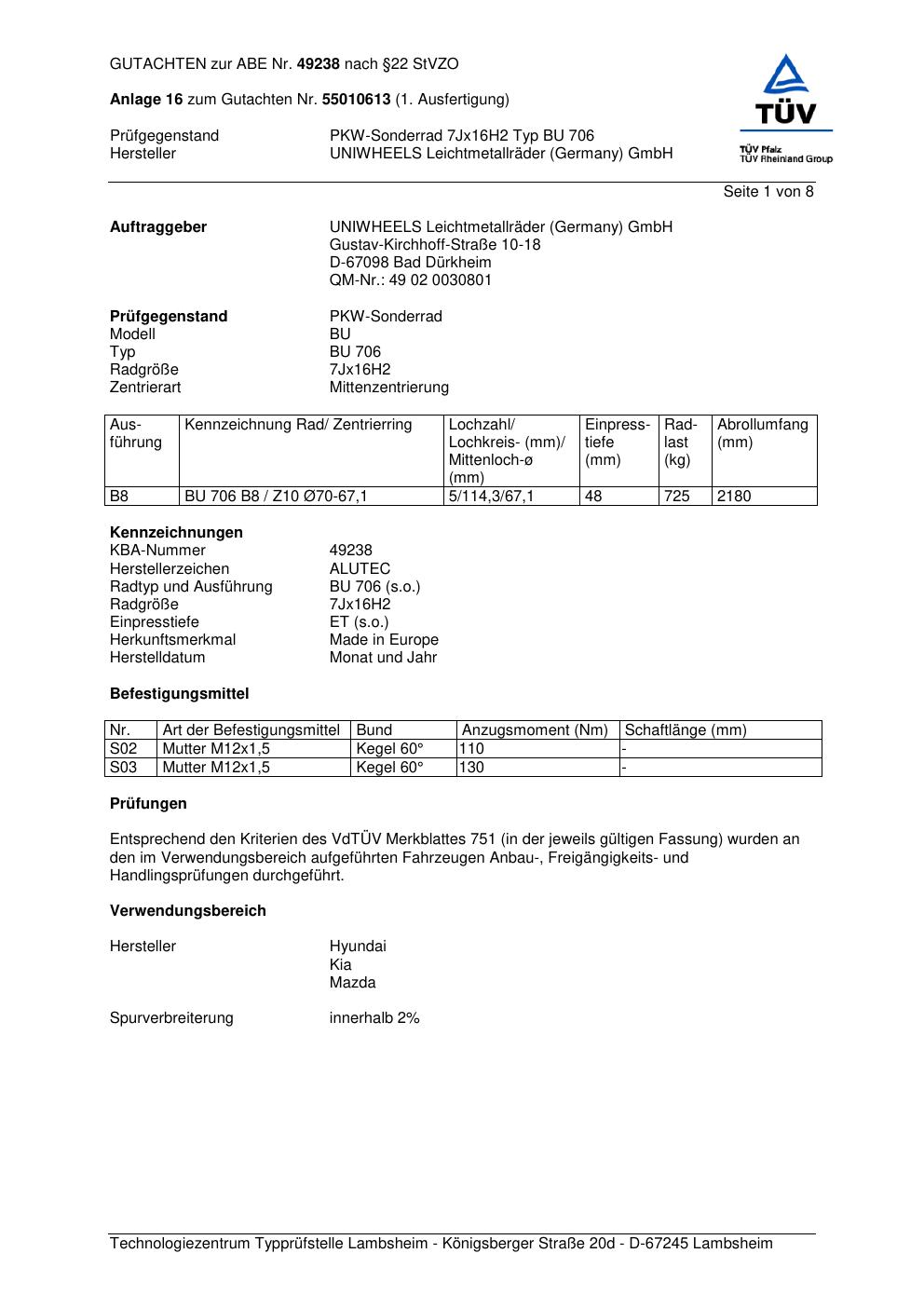 Dieses Gutachten (abe) bezieht sich auf die Alufelge ALUTEC BU 706 in der Ausführung 7Jx16 ET 0, Mittenloch 0 mm (KBA 49238). Im PDF findest du typischerweise zulässige Reifengrößen, Auflagen/Anbauhinweise und – je nach Dokument – Hinweise zur Eintragung.
