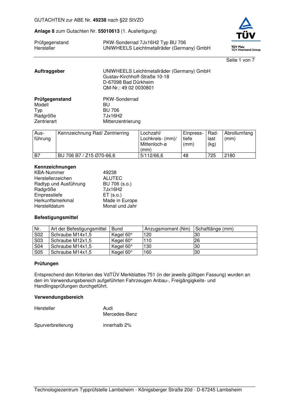 Dieses Gutachten (abe) bezieht sich auf die Alufelge ALUTEC BU 706 in der Ausführung 7Jx16 ET 0, Mittenloch 0 mm (KBA 49238). Im PDF findest du typischerweise zulässige Reifengrößen, Auflagen/Anbauhinweise und – je nach Dokument – Hinweise zur Eintragung.