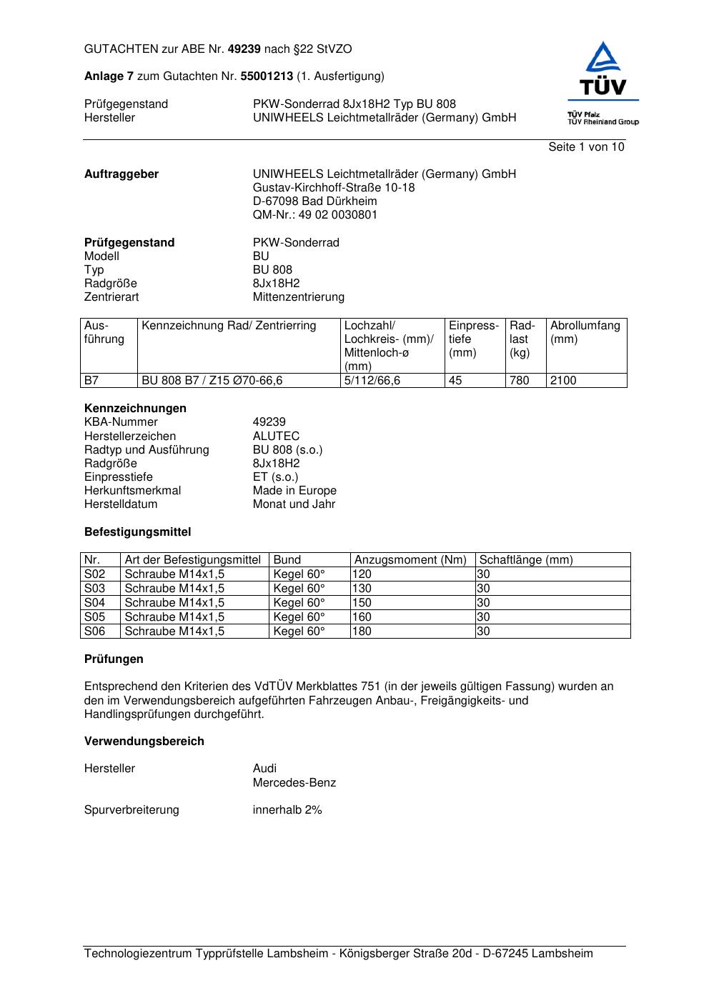 Felgengutachten / abe für Alufelgen ALUTEC BU 808 (8Jx18 ET 0, Mittenloch 0 mm) mit KBA 49239 (Zertifikatsnummer 49239). Hier kostenlos als PDF herunterladen. Der Download-Link ist 24 Stunden gültig und kann bis zu zwei Mal verwendet werden.