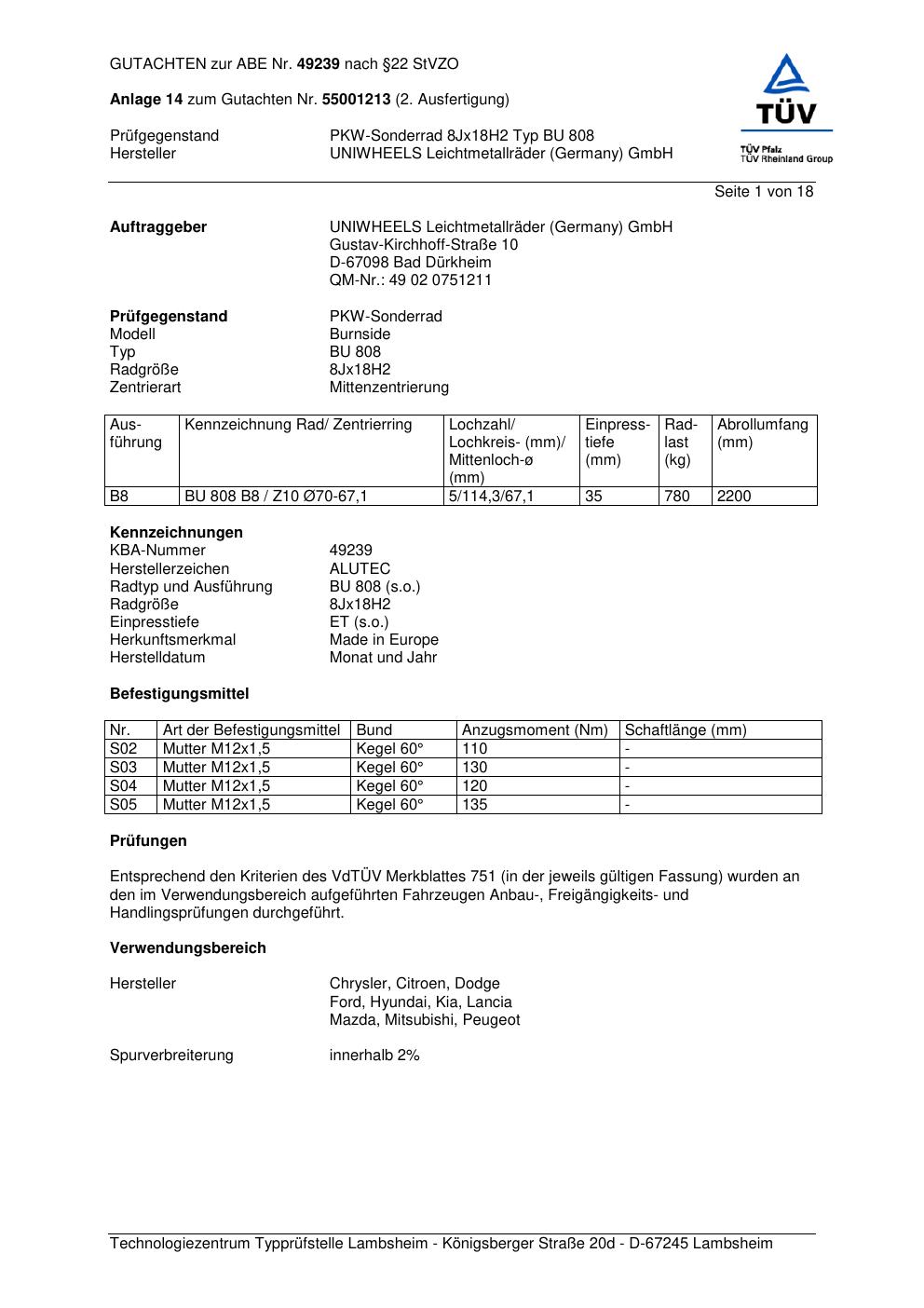 Dieses Gutachten (abe) bezieht sich auf die Alufelge ALUTEC BU 808 in der Ausführung 8Jx18 ET 0, Mittenloch 0 mm (KBA 49239). Im PDF findest du typischerweise zulässige Reifengrößen, Auflagen/Anbauhinweise und – je nach Dokument – Hinweise zur Eintragung.