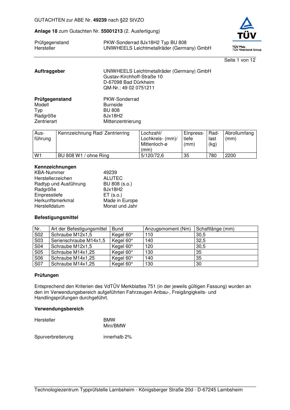 Dieses Gutachten (abe) bezieht sich auf die Alufelge ALUTEC BU 808 in der Ausführung 8Jx18 ET 0, Mittenloch 0 mm (KBA 49239). Im PDF findest du typischerweise zulässige Reifengrößen, Auflagen/Anbauhinweise und – je nach Dokument – Hinweise zur Eintragung.