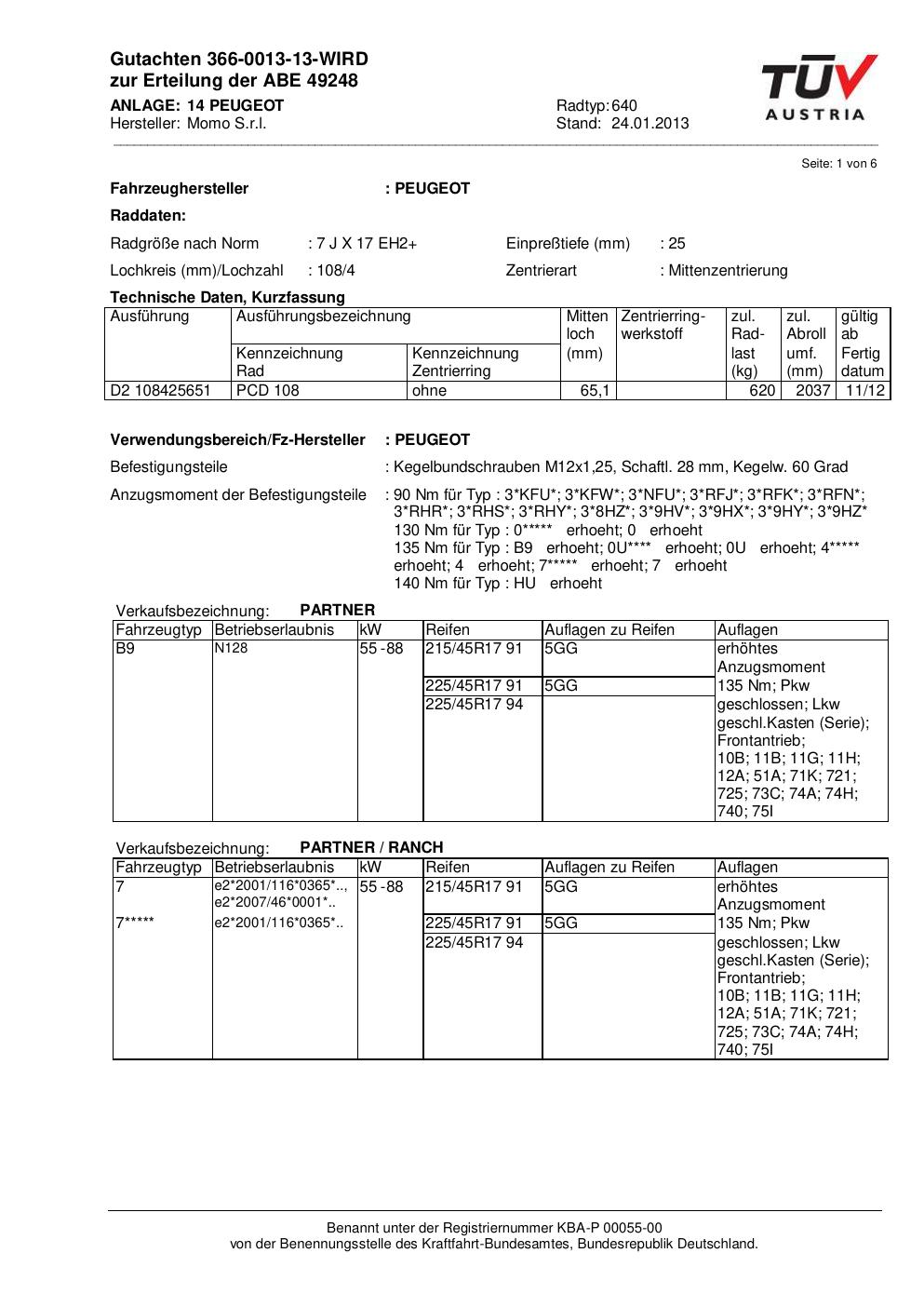 Dieses Gutachten (abe) bezieht sich auf die Alufelge Momo 640 in der Ausführung 7Jx17 ET 0, Mittenloch 0 mm (KBA 49248). Im PDF findest du typischerweise zulässige Reifengrößen, Auflagen/Anbauhinweise und – je nach Dokument – Hinweise zur Eintragung.