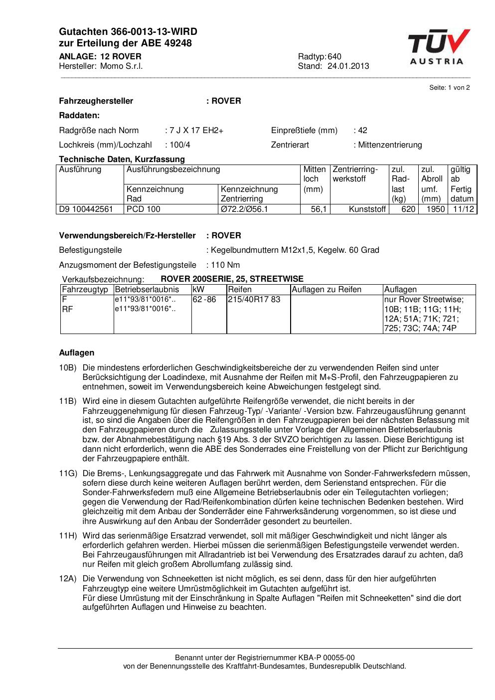 Dieses Gutachten (abe) bezieht sich auf die Alufelge Momo 640 in der Ausführung 7Jx17 ET 0, Mittenloch 0 mm (KBA 49248). Im PDF findest du typischerweise zulässige Reifengrößen, Auflagen/Anbauhinweise und – je nach Dokument – Hinweise zur Eintragung.