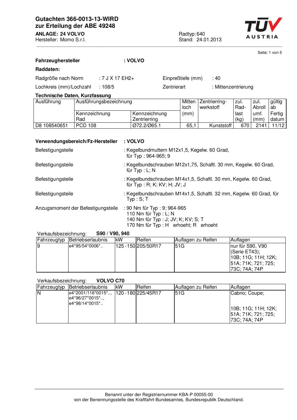 Felgengutachten / abe für Alufelgen Momo 640 (7Jx17 ET 0, Mittenloch 0 mm) mit KBA 49248 (Zertifikatsnummer 49248). Hier kostenlos als PDF herunterladen. Der Download-Link ist 24 Stunden gültig und kann bis zu zwei Mal verwendet werden.