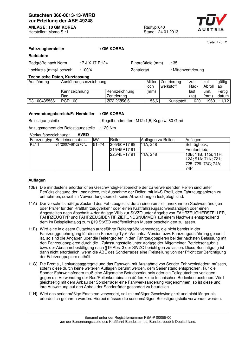 Felgengutachten / abe für Alufelgen Momo 640 (7Jx17 ET 0, Mittenloch 0 mm) mit KBA 49248 (Zertifikatsnummer 49248). Hier kostenlos als PDF herunterladen. Der Download-Link ist 24 Stunden gültig und kann bis zu zwei Mal verwendet werden.