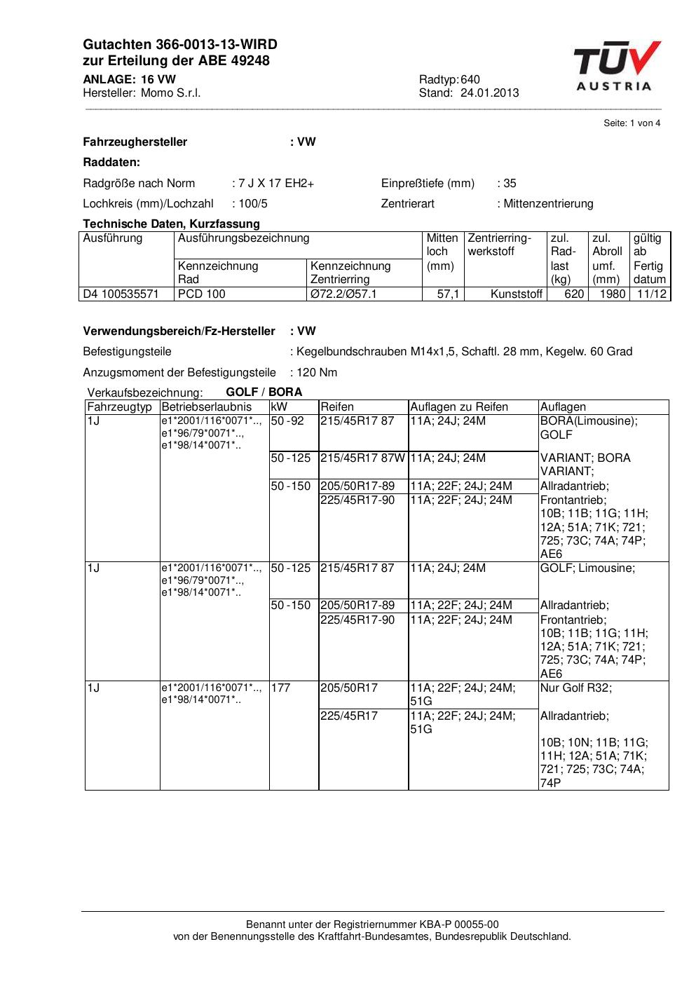 Dieses Gutachten (abe) bezieht sich auf die Alufelge Momo 640 in der Ausführung 7Jx17 ET 0, Mittenloch 0 mm (KBA 49248). Im PDF findest du typischerweise zulässige Reifengrößen, Auflagen/Anbauhinweise und – je nach Dokument – Hinweise zur Eintragung.