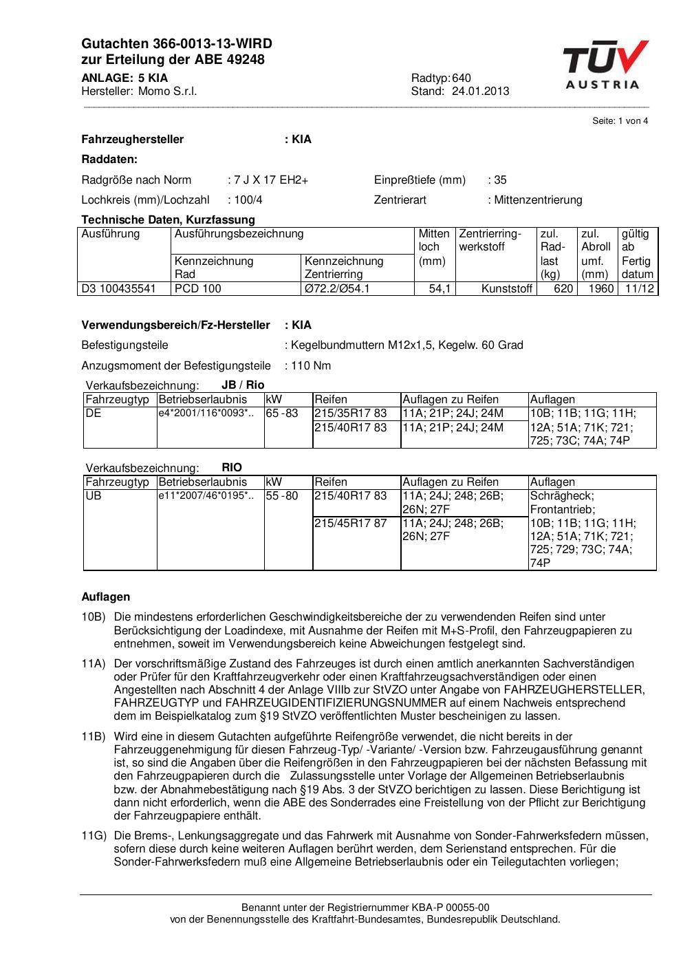 Felgengutachten / abe für Alufelgen Momo 640 (7Jx17 ET 0, Mittenloch 0 mm) mit KBA 49248 (Zertifikatsnummer 49248). Hier kostenlos als PDF herunterladen. Der Download-Link ist 24 Stunden gültig und kann bis zu zwei Mal verwendet werden.