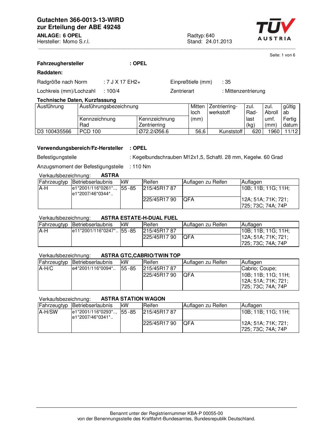 Felgengutachten / abe für Alufelgen Momo 640 (7Jx17 ET 0, Mittenloch 0 mm) mit KBA 49248 (Zertifikatsnummer 49248). Hier kostenlos als PDF herunterladen. Der Download-Link ist 24 Stunden gültig und kann bis zu zwei Mal verwendet werden.
