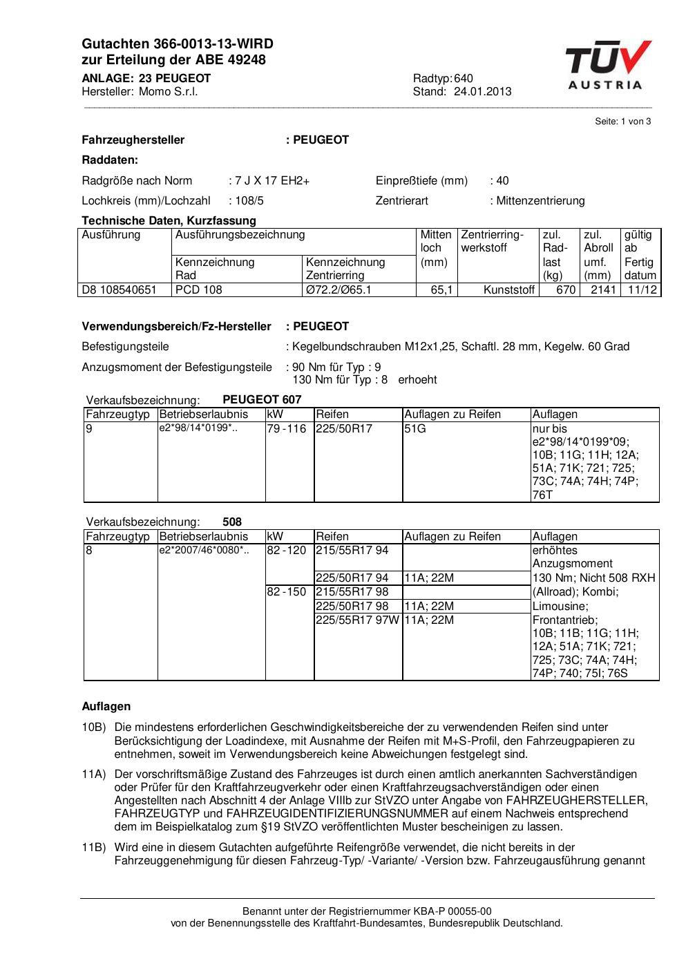 Dieses Gutachten (abe) bezieht sich auf die Alufelge Momo 640 in der Ausführung 7Jx17 ET 0, Mittenloch 0 mm (KBA 49248). Im PDF findest du typischerweise zulässige Reifengrößen, Auflagen/Anbauhinweise und – je nach Dokument – Hinweise zur Eintragung.