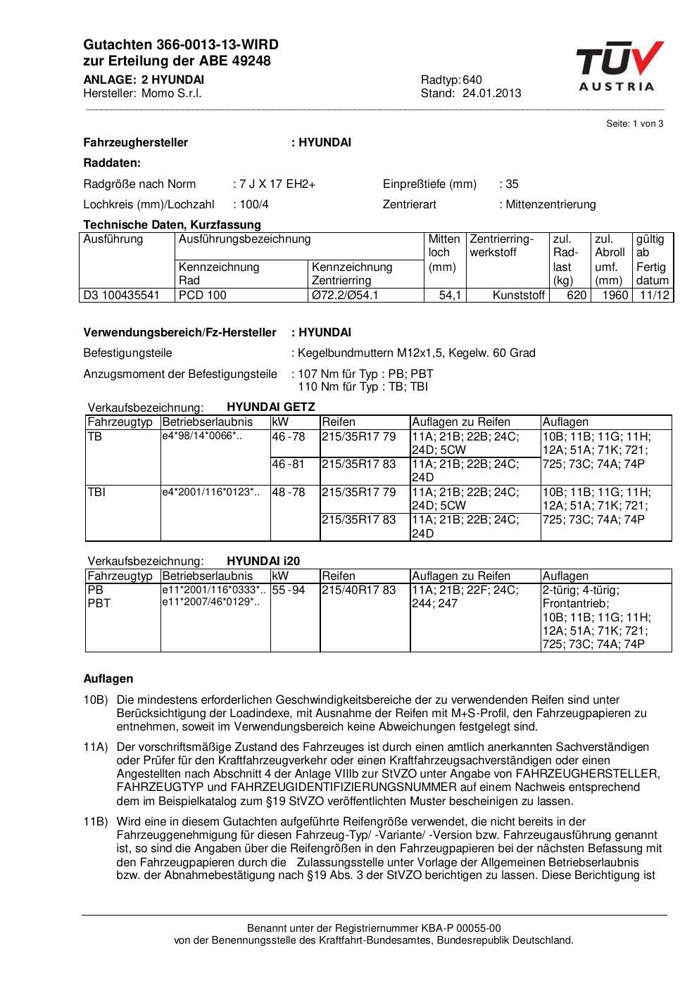 Dieses Gutachten (abe) bezieht sich auf die Alufelge Momo 640 in der Ausführung 7Jx17 ET 0, Mittenloch 0 mm (KBA 49248). Im PDF findest du typischerweise zulässige Reifengrößen, Auflagen/Anbauhinweise und – je nach Dokument – Hinweise zur Eintragung.