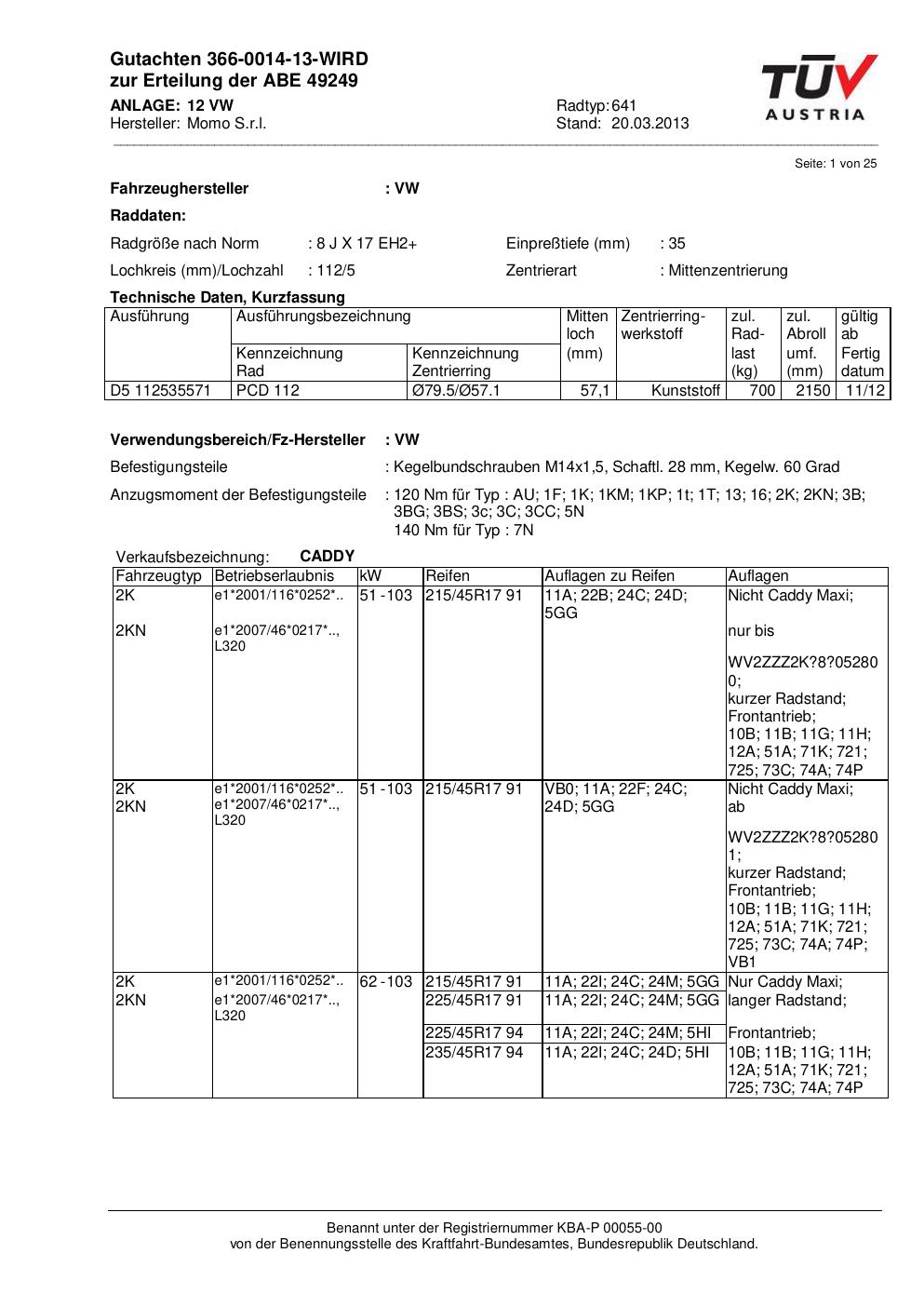 Dieses Gutachten (abe) bezieht sich auf die Alufelge Momo 641 in der Ausführung 8Jx17 ET 0, Mittenloch 0 mm (KBA 49249). Im PDF findest du typischerweise zulässige Reifengrößen, Auflagen/Anbauhinweise und – je nach Dokument – Hinweise zur Eintragung.