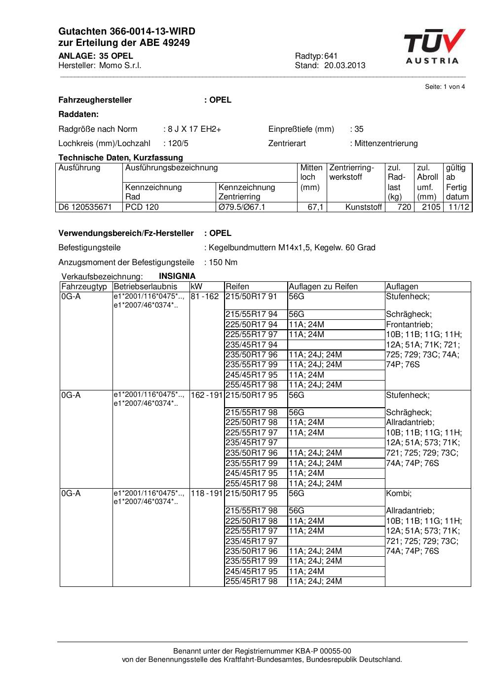 Dieses Gutachten (abe) bezieht sich auf die Alufelge Momo 641 in der Ausführung 8Jx17 ET 0, Mittenloch 0 mm (KBA 49249). Im PDF findest du typischerweise zulässige Reifengrößen, Auflagen/Anbauhinweise und – je nach Dokument – Hinweise zur Eintragung.