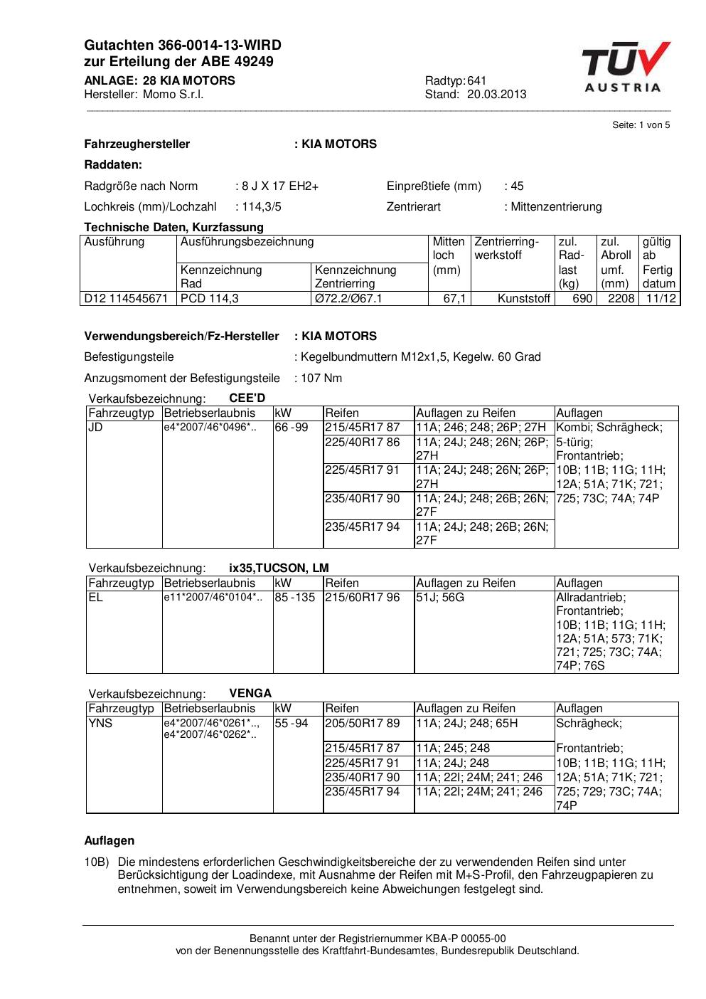 Felgengutachten / abe für Alufelgen Momo 641 (8Jx17 ET 0, Mittenloch 0 mm) mit KBA 49249 (Zertifikatsnummer 49249). Hier kostenlos als PDF herunterladen. Der Download-Link ist 24 Stunden gültig und kann bis zu zwei Mal verwendet werden.