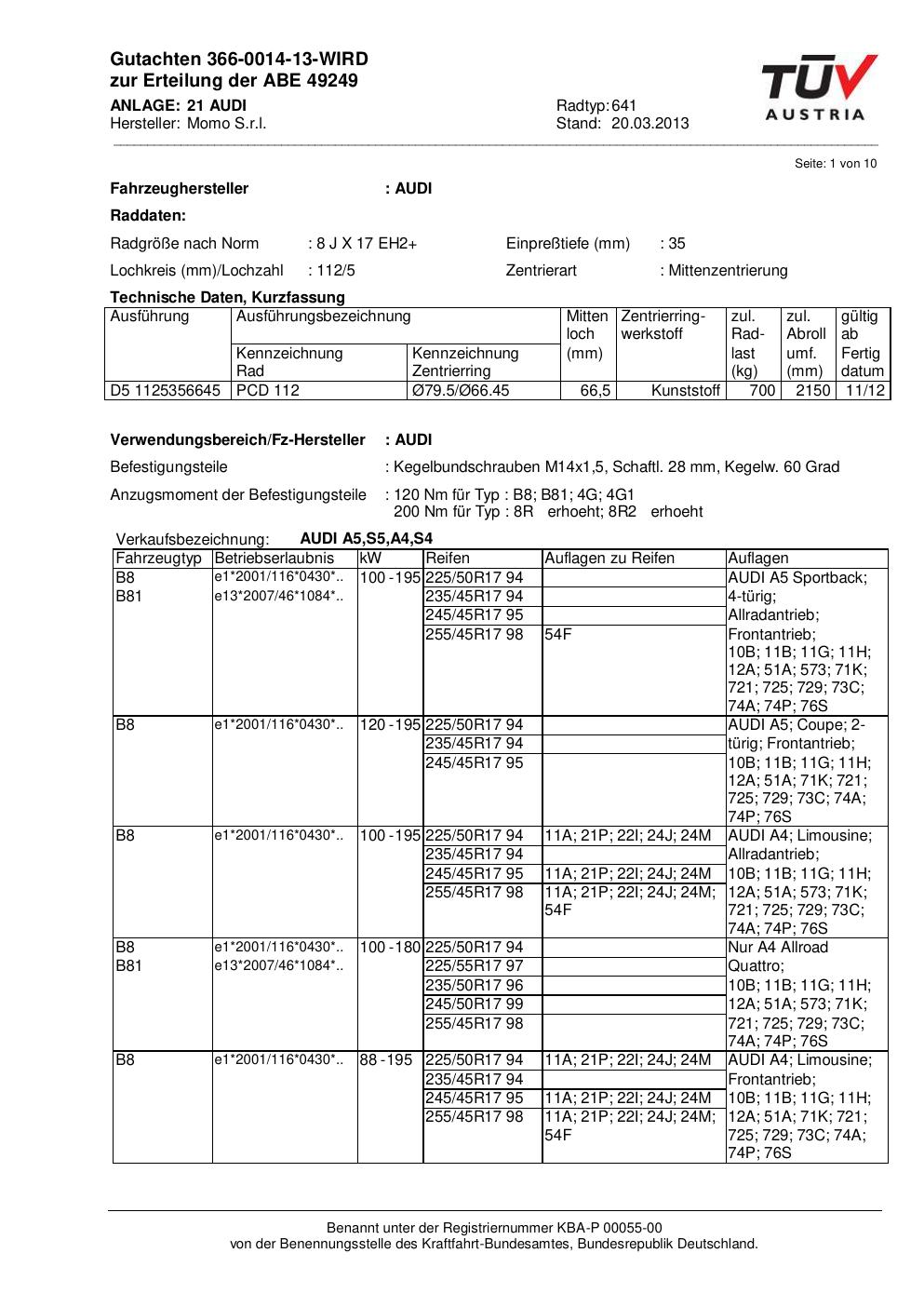 Dieses Gutachten (abe) bezieht sich auf die Alufelge Momo 641 in der Ausführung 8Jx17 ET 0, Mittenloch 0 mm (KBA 49249). Im PDF findest du typischerweise zulässige Reifengrößen, Auflagen/Anbauhinweise und – je nach Dokument – Hinweise zur Eintragung.