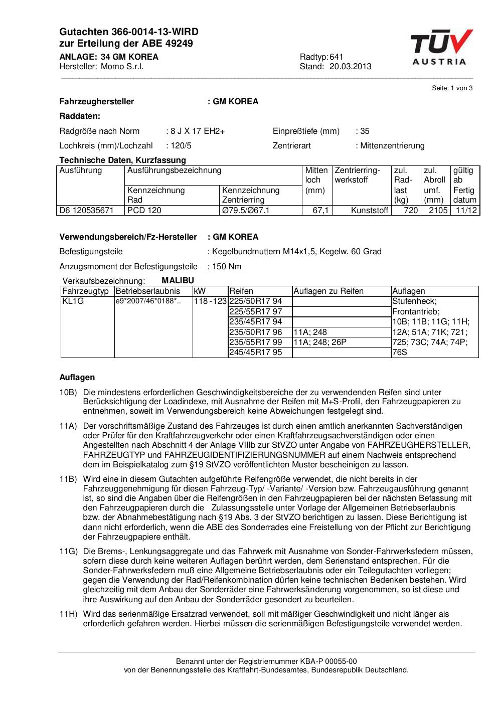 Dieses Gutachten (abe) bezieht sich auf die Alufelge Momo 641 in der Ausführung 8Jx17 ET 0, Mittenloch 0 mm (KBA 49249). Im PDF findest du typischerweise zulässige Reifengrößen, Auflagen/Anbauhinweise und – je nach Dokument – Hinweise zur Eintragung.