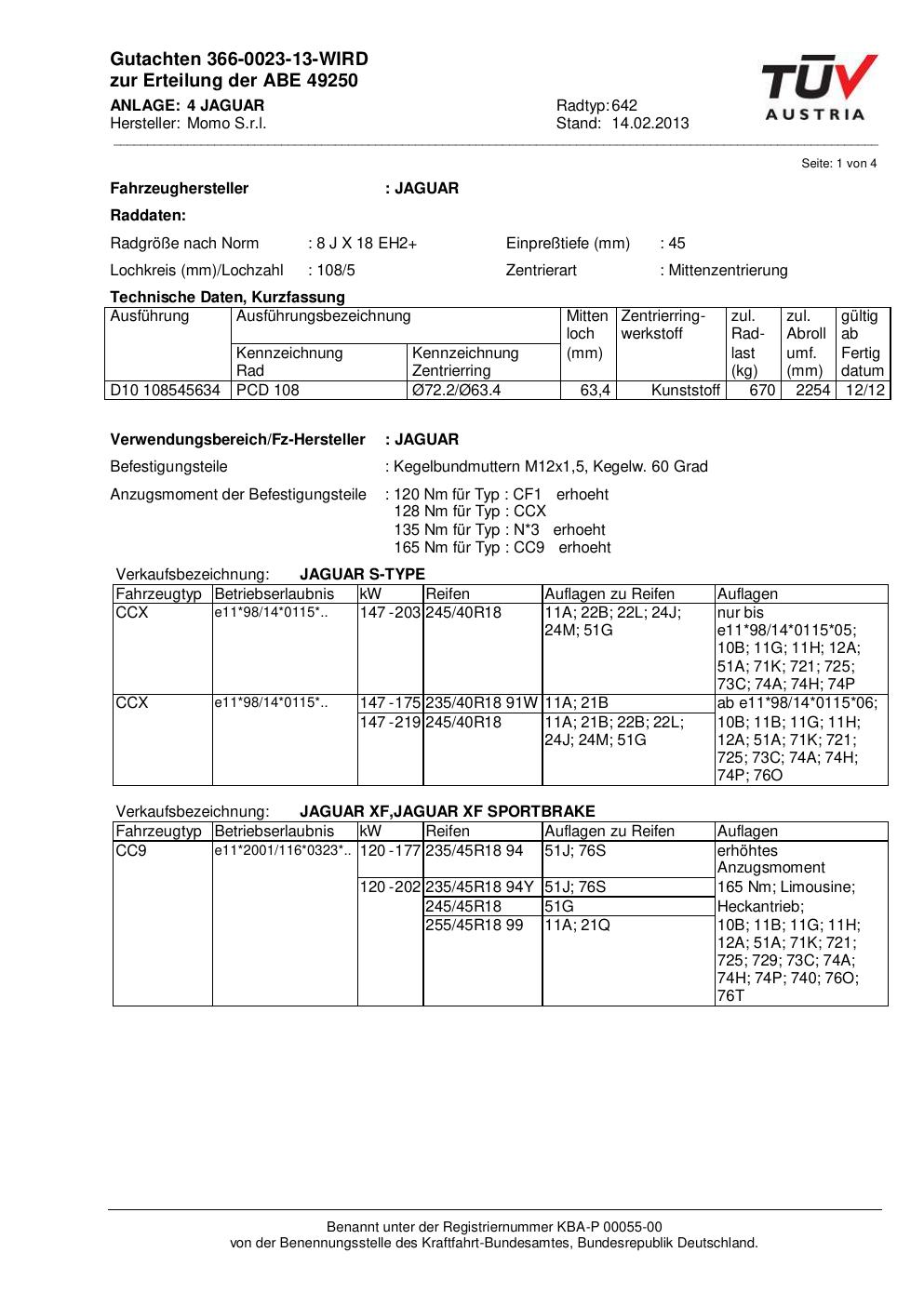 Dieses Gutachten (abe) bezieht sich auf die Alufelge Momo 642 in der Ausführung 8Jx18 ET 0, Mittenloch 0 mm (KBA 49250). Im PDF findest du typischerweise zulässige Reifengrößen, Auflagen/Anbauhinweise und – je nach Dokument – Hinweise zur Eintragung.