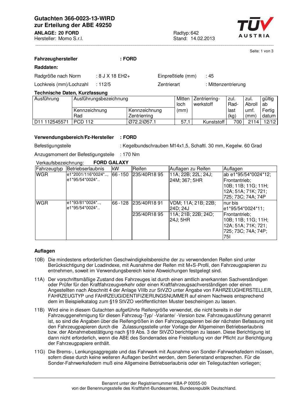 Dieses Gutachten (abe) bezieht sich auf die Alufelge Momo 642 in der Ausführung 8Jx18 ET 0, Mittenloch 0 mm (KBA 49250). Im PDF findest du typischerweise zulässige Reifengrößen, Auflagen/Anbauhinweise und – je nach Dokument – Hinweise zur Eintragung.