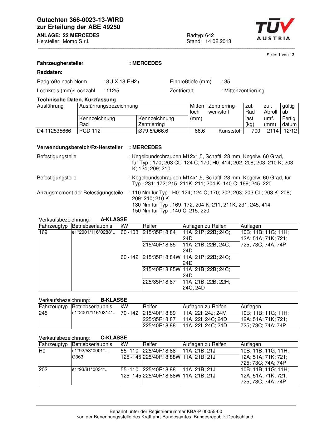 Dieses Gutachten (abe) bezieht sich auf die Alufelge Momo 642 in der Ausführung 8Jx18 ET 0, Mittenloch 0 mm (KBA 49250). Im PDF findest du typischerweise zulässige Reifengrößen, Auflagen/Anbauhinweise und – je nach Dokument – Hinweise zur Eintragung.
