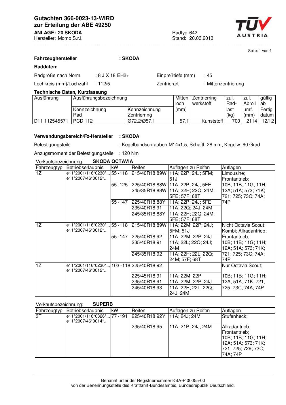 Dieses Gutachten (abe) bezieht sich auf die Alufelge Momo 642 in der Ausführung 8Jx18 ET 0, Mittenloch 0 mm (KBA 49250). Im PDF findest du typischerweise zulässige Reifengrößen, Auflagen/Anbauhinweise und – je nach Dokument – Hinweise zur Eintragung.