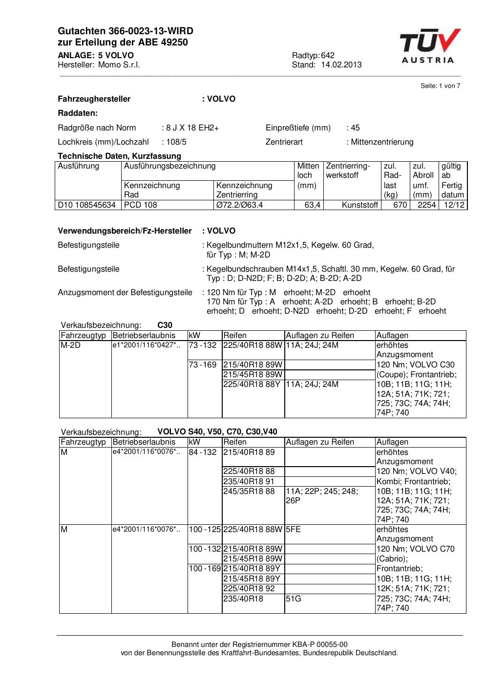Dieses Gutachten (abe) bezieht sich auf die Alufelge Momo 642 in der Ausführung 8Jx18 ET 0, Mittenloch 0 mm (KBA 49250). Im PDF findest du typischerweise zulässige Reifengrößen, Auflagen/Anbauhinweise und – je nach Dokument – Hinweise zur Eintragung.