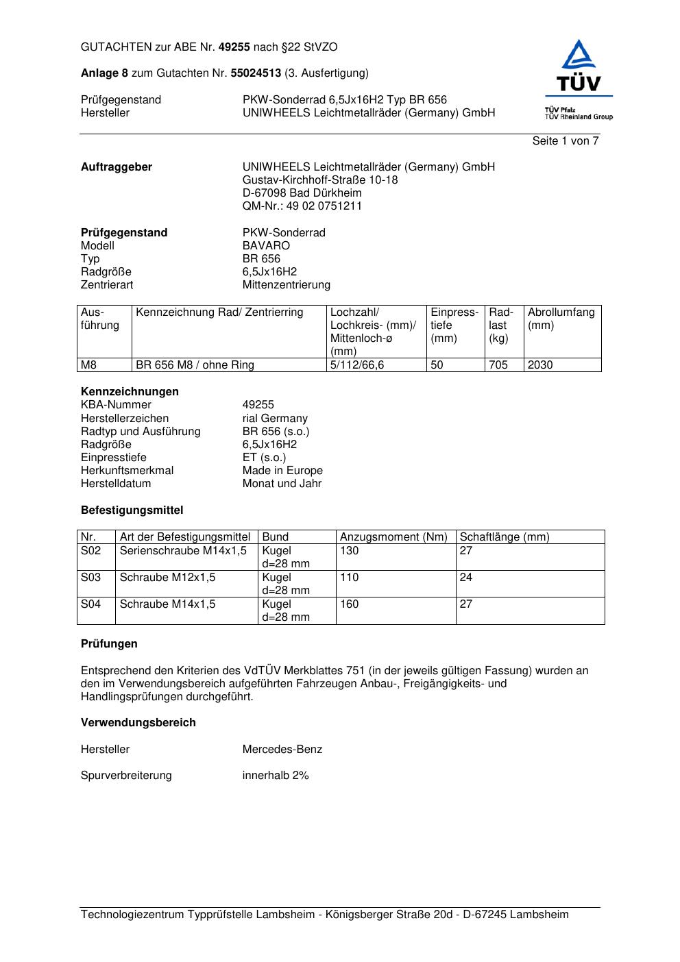 Dieses Gutachten (abe) bezieht sich auf die Alufelge brand-rial BR 656 in der Ausführung 6.5Jx16 ET 0, Mittenloch 0 mm (KBA 49255). Im PDF findest du typischerweise zulässige Reifengrößen, Auflagen/Anbauhinweise und – je nach Dokument – Hinweise zur Eintragung.