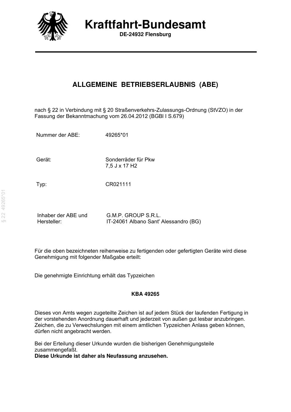 Dieses Gutachten (abe) bezieht sich auf die Alufelge ATS CR021111 in der Ausführung 7.5Jx17 ET 0, Mittenloch 0 mm (KBA 49265). Im PDF findest du typischerweise zulässige Reifengrößen, Auflagen/Anbauhinweise und – je nach Dokument – Hinweise zur Eintragung.