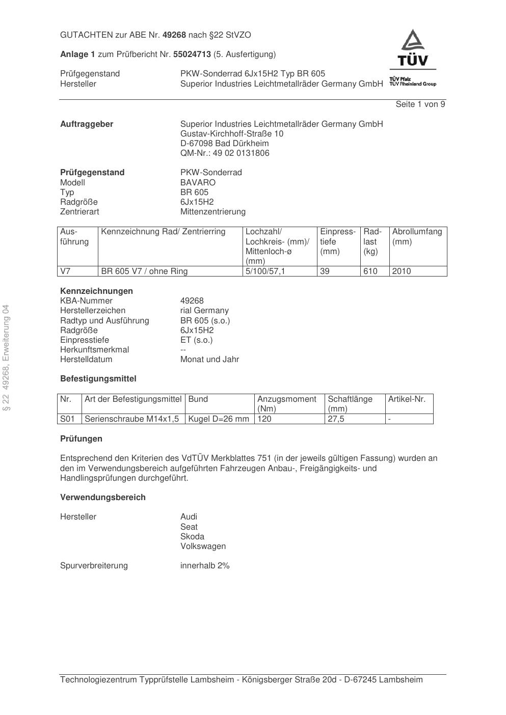 Dieses Gutachten (abe) bezieht sich auf die Alufelge brand-rial BR 605 in der Ausführung 6Jx15 ET 0, Mittenloch 0 mm (KBA 49268). Im PDF findest du typischerweise zulässige Reifengrößen, Auflagen/Anbauhinweise und – je nach Dokument – Hinweise zur Eintragung.