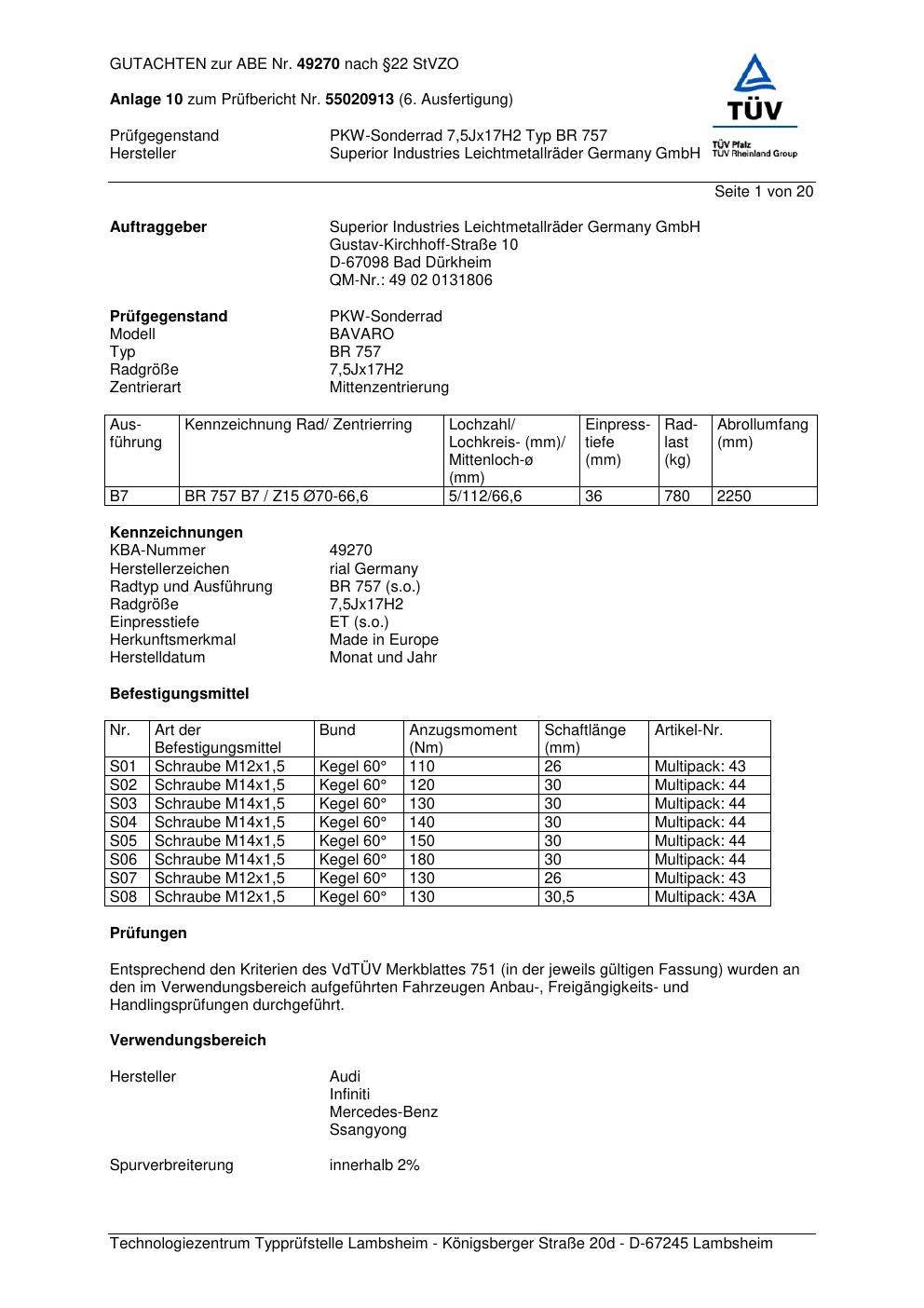 Dieses Gutachten (abe) bezieht sich auf die Alufelge brand-rial BR 757 in der Ausführung 7.5Jx17 ET 0, Mittenloch 0 mm (KBA 49270). Im PDF findest du typischerweise zulässige Reifengrößen, Auflagen/Anbauhinweise und – je nach Dokument – Hinweise zur Eintragung.