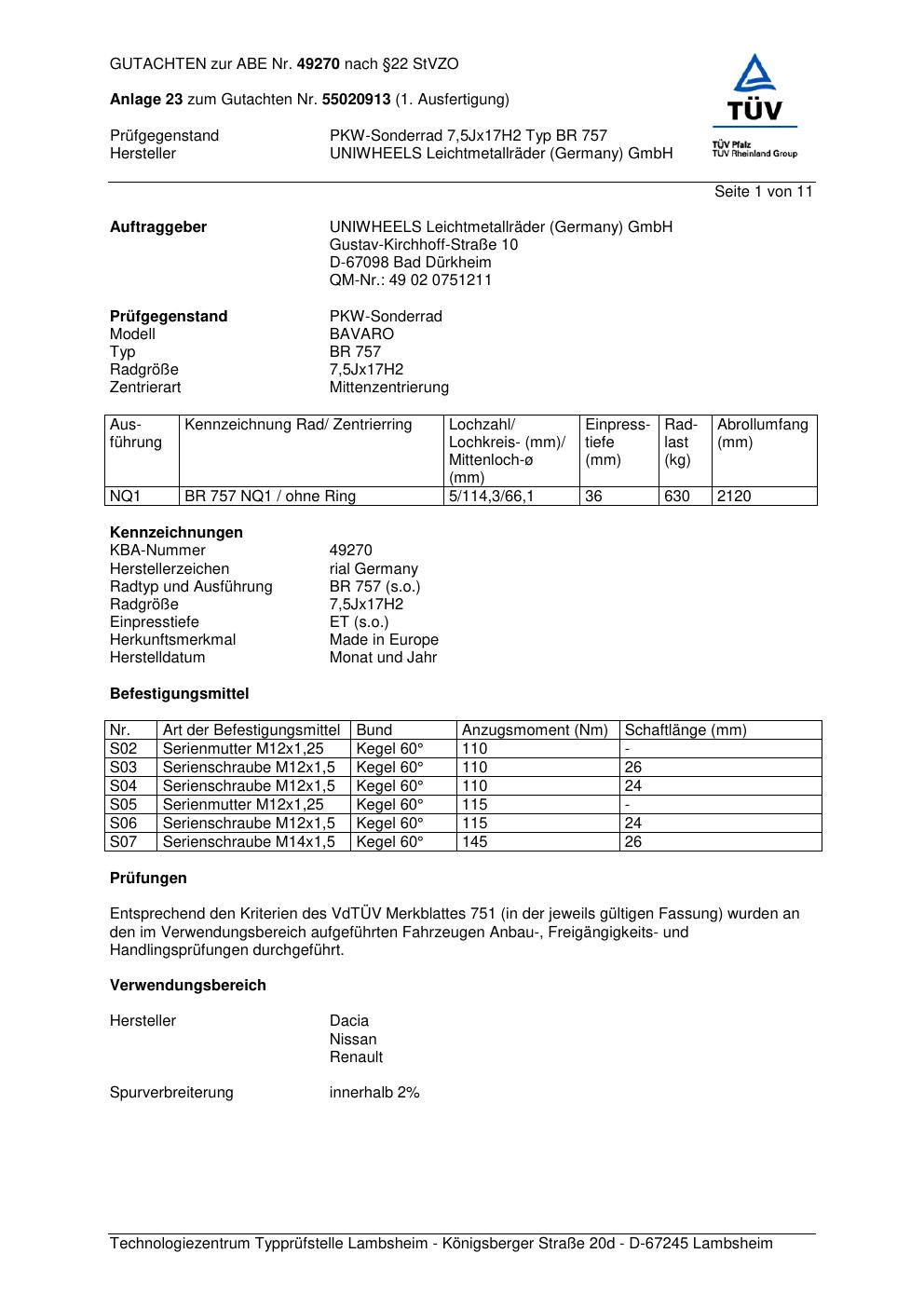 Dieses Gutachten (abe) bezieht sich auf die Alufelge brand-rial BR 757 in der Ausführung 7.5Jx17 ET 0, Mittenloch 0 mm (KBA 49270). Im PDF findest du typischerweise zulässige Reifengrößen, Auflagen/Anbauhinweise und – je nach Dokument – Hinweise zur Eintragung.