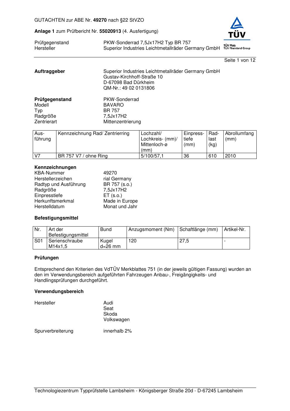 Dieses Gutachten (abe) bezieht sich auf die Alufelge brand-rial BR 757 in der Ausführung 7.5Jx17 ET 0, Mittenloch 0 mm (KBA 49270). Im PDF findest du typischerweise zulässige Reifengrößen, Auflagen/Anbauhinweise und – je nach Dokument – Hinweise zur Eintragung.