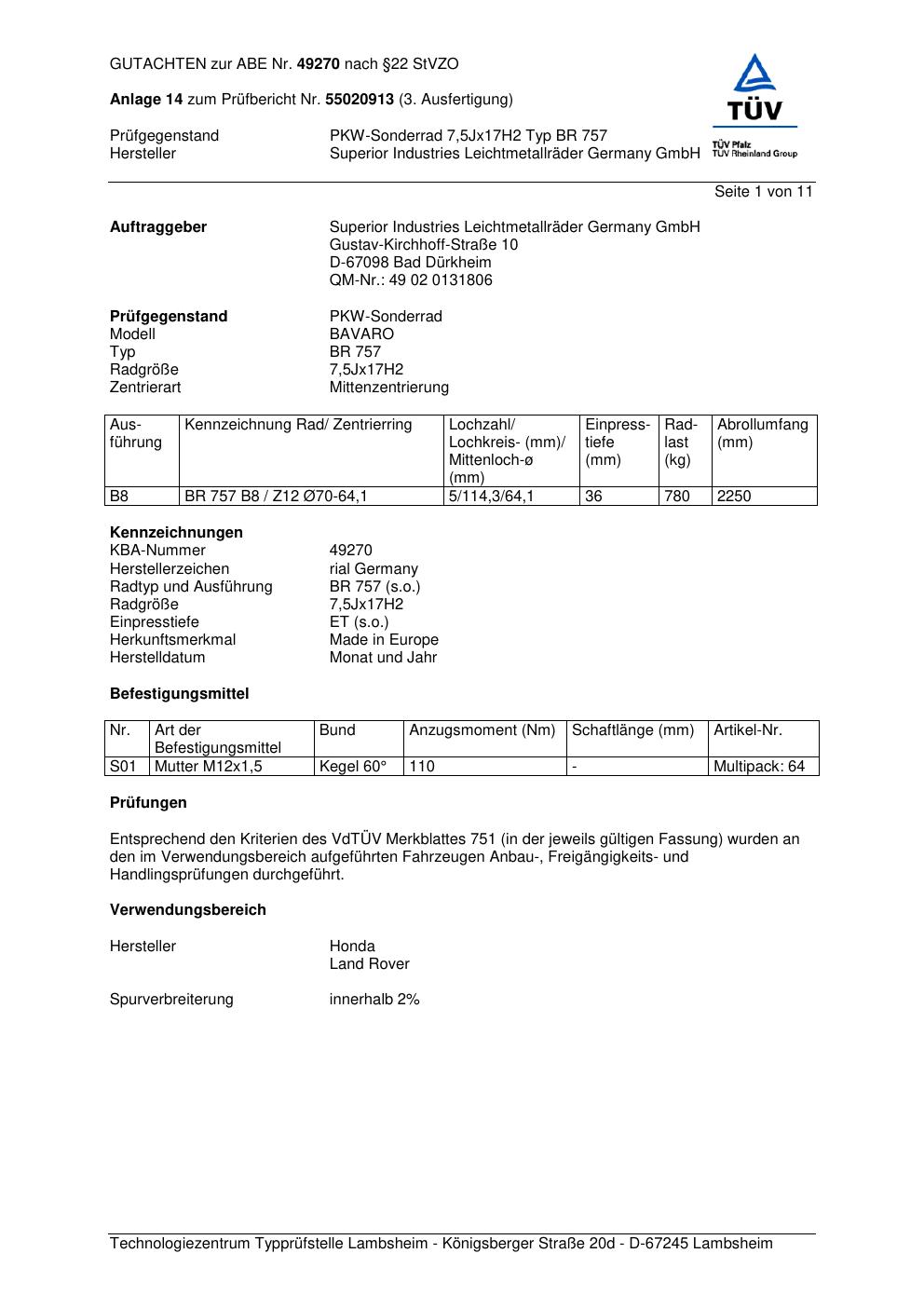 Dieses Gutachten (abe) bezieht sich auf die Alufelge brand-rial BR 757 in der Ausführung 7.5Jx17 ET 0, Mittenloch 0 mm (KBA 49270). Im PDF findest du typischerweise zulässige Reifengrößen, Auflagen/Anbauhinweise und – je nach Dokument – Hinweise zur Eintragung.