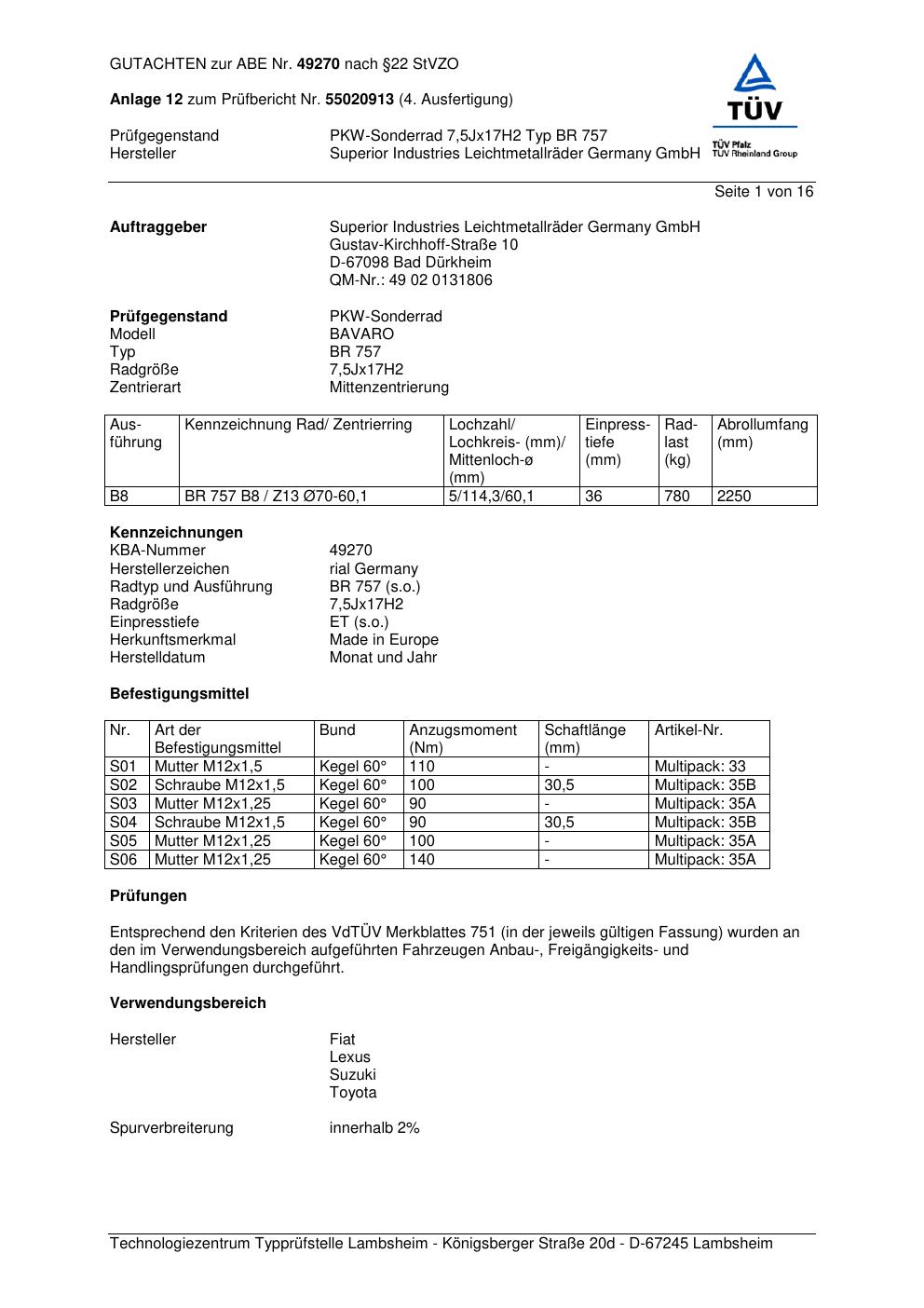 Dieses Gutachten (abe) bezieht sich auf die Alufelge brand-rial BR 757 in der Ausführung 7.5Jx17 ET 0, Mittenloch 0 mm (KBA 49270). Im PDF findest du typischerweise zulässige Reifengrößen, Auflagen/Anbauhinweise und – je nach Dokument – Hinweise zur Eintragung.