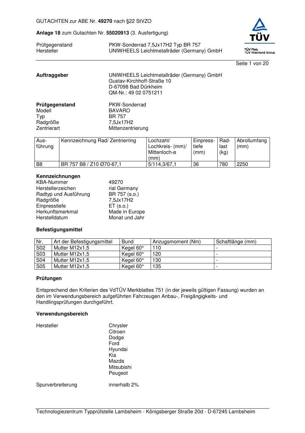 Dieses Gutachten (abe) bezieht sich auf die Alufelge Rial BR 757 in der Ausführung 7.5Jx17 ET 0, Mittenloch 0 mm (KBA 49270). Im PDF findest du typischerweise zulässige Reifengrößen, Auflagen/Anbauhinweise und – je nach Dokument – Hinweise zur Eintragung.